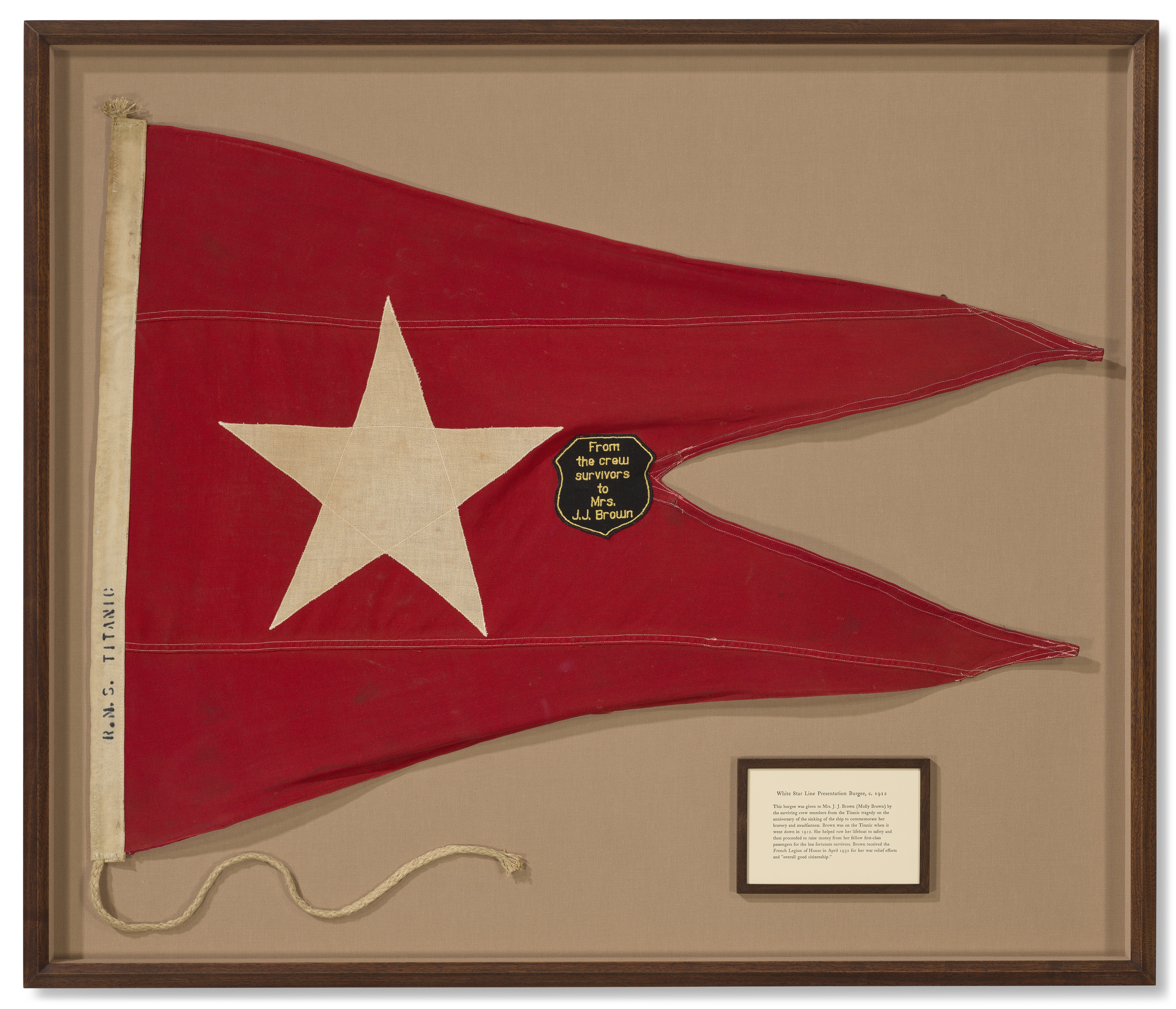 ‘The tragedy of the Titanic continues to loom large in our culture, over 100 years after the fact, and objects associated with the event continue to interest collectors. This burgee was presented to passenger Molly Brown to commemorate her efforts to get the crew in her lifeboat to go back and look for more survivors, which the sailor captaining the boat ultimately resisted. Brown became known as the Unsinkable Molly Brown. Although the burgee wasn’t on the Titanic itself, it has this wonderful association with someone who holds an important place within that story.