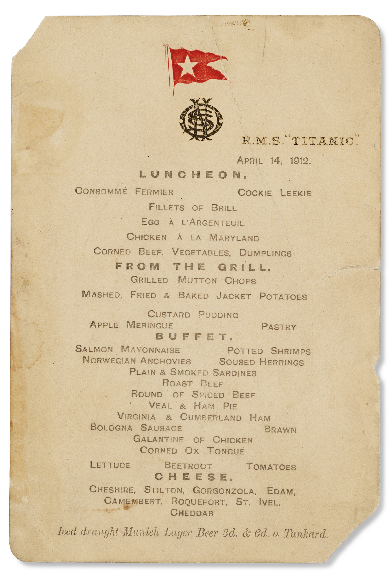 R.M.S. Titanic, First class luncheon menu, 14 April 1912. Sheet: 6¼ x 4¼ in (15.9 x 10.8 cm). Estimate: $30,000–50,000. Offered in Pushing Boundaries: Ingenuity from the Paul G. Allen Collection on 10 September 2024 at Christie’s in New York