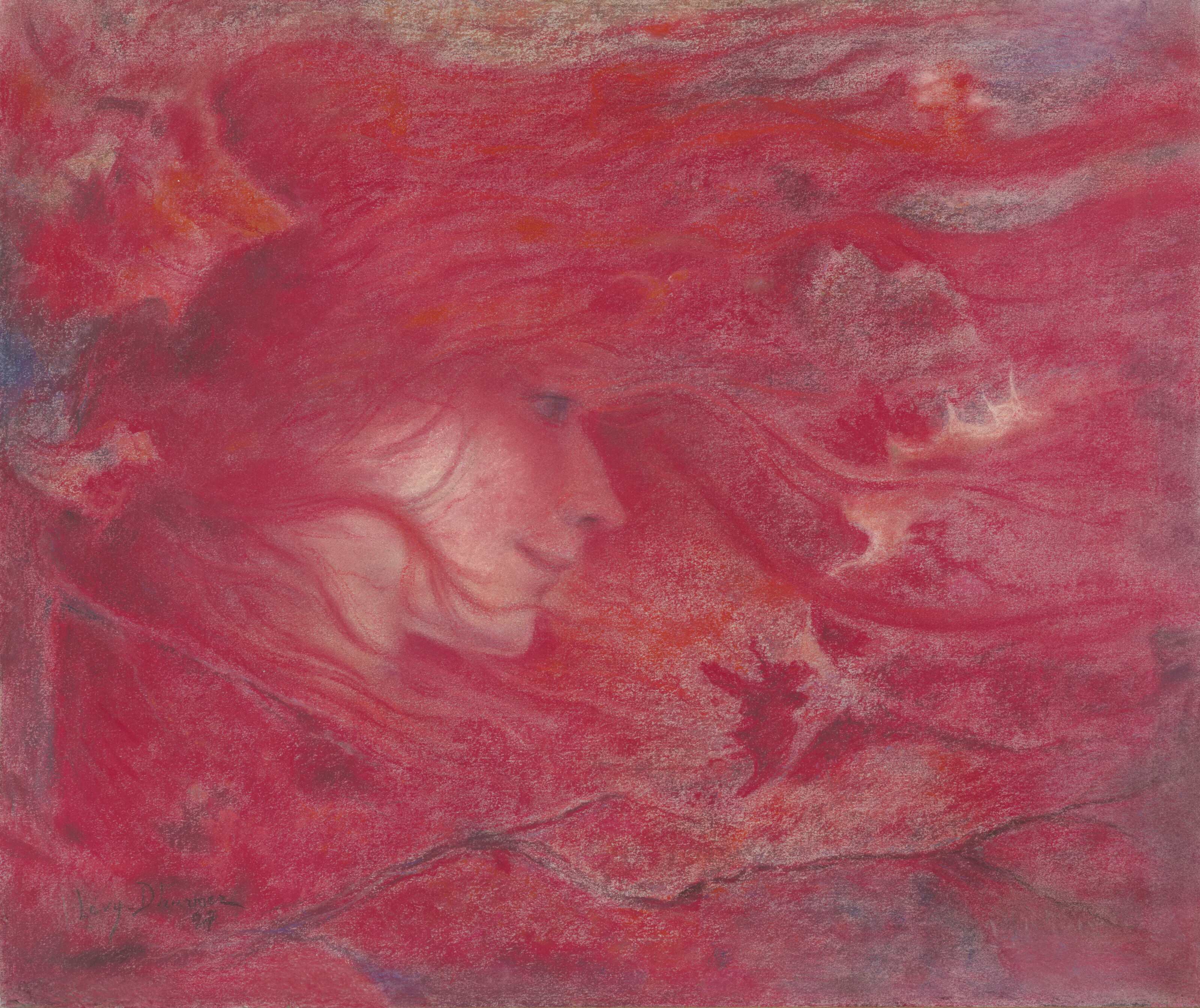 That hair also merges with the semi-abstract, crimson scene around her, as if she’s in the midst of being blown into a sprightly otherworld. Not for nothing was Lévy-Dhurmer described by the contemporary critic Gabriel Mourey as ‘the dream painter’.