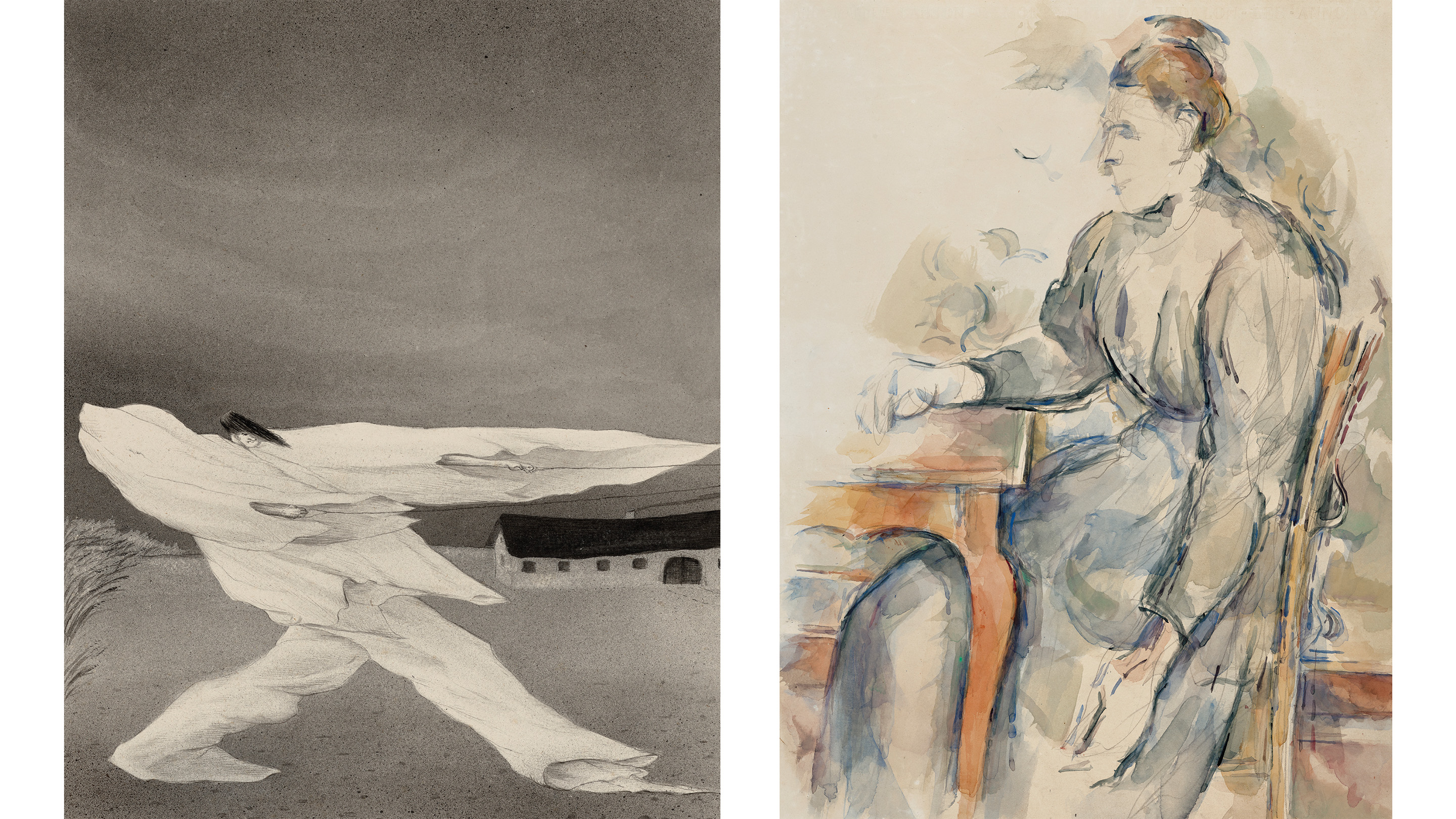 Left: Paul Cezanne (1839-1906), Femme assise (Madame Cezanne), 1902-04. Watercolour and pencil on paper. 48.9 x 37.1 cm (19¼ x 14⅝ in). Estimate: €3,500,000-5,500,000. Right: Alfred Kubin (1877-1959), Der Sturm, 1902-03. Brush and pen and India ink, inkwash and Spritztechnik on paper. Image: 27.6 x 22.2 cm (10⅞ x 8¾ in). Sheet: 39.3 x 30.8 cm (15½ x 9¼ in). Estimate: €450,000-650,000. Both offered in Radical Genius: Works on Paper from A Distinguished Private Collection on 15 April 2026 at Christie’s in Paris