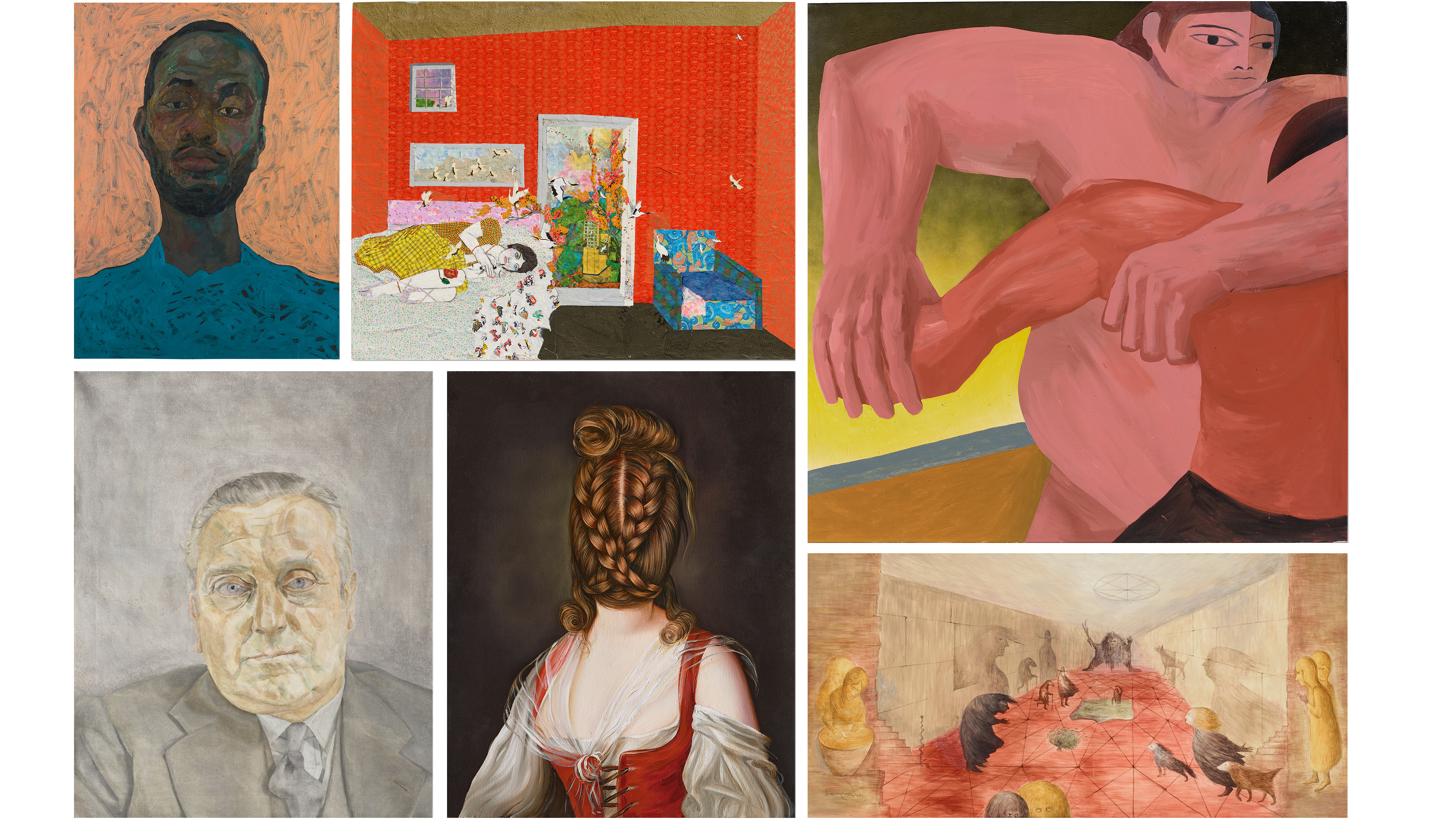 Main image, clockwise from top left: Amoako Boafo (b. 1984), Portrait, 2018. Oil on paper. 35⅜ x 26 in (90 x 66 cm); María Berrío (b. 1982), I am not from Here, I am not from There, 2016. Watercolour, acrylic, gold leaf, glitter and Japanese rice paper collage on canvas. 48 x 60¼ in (122 x 153 cm); Vojtěch Kovařík (b. 1993), Battle, 2019. Acrylic and spray paint on canvas. 78¾ x 78¾ in (200 x 200 cm); Leonora Carrington (1917-2011), Belfry, 1988. Tempera on Fibracel. 14⅞ x 30 in (37.8 x 76.2 cm); Ewa Juszkiewicz (b. 1984), Portrait of Carol Rama, 2014. Oil on canvas. 19¾ x 15¾ in (50 x 40 cm); Lucian Freud (1922-2011), Portrait of a Man, circa 1955. Oil on canvas. 20⅛ x 16⅛ in (51 x 41 cm). All works price on request. Offered in Selfhood: Explorations of Being and Becoming in 20th and 21st Century Art, on show until 13 July 2023 at Christie’s in London, and available online until 31 August