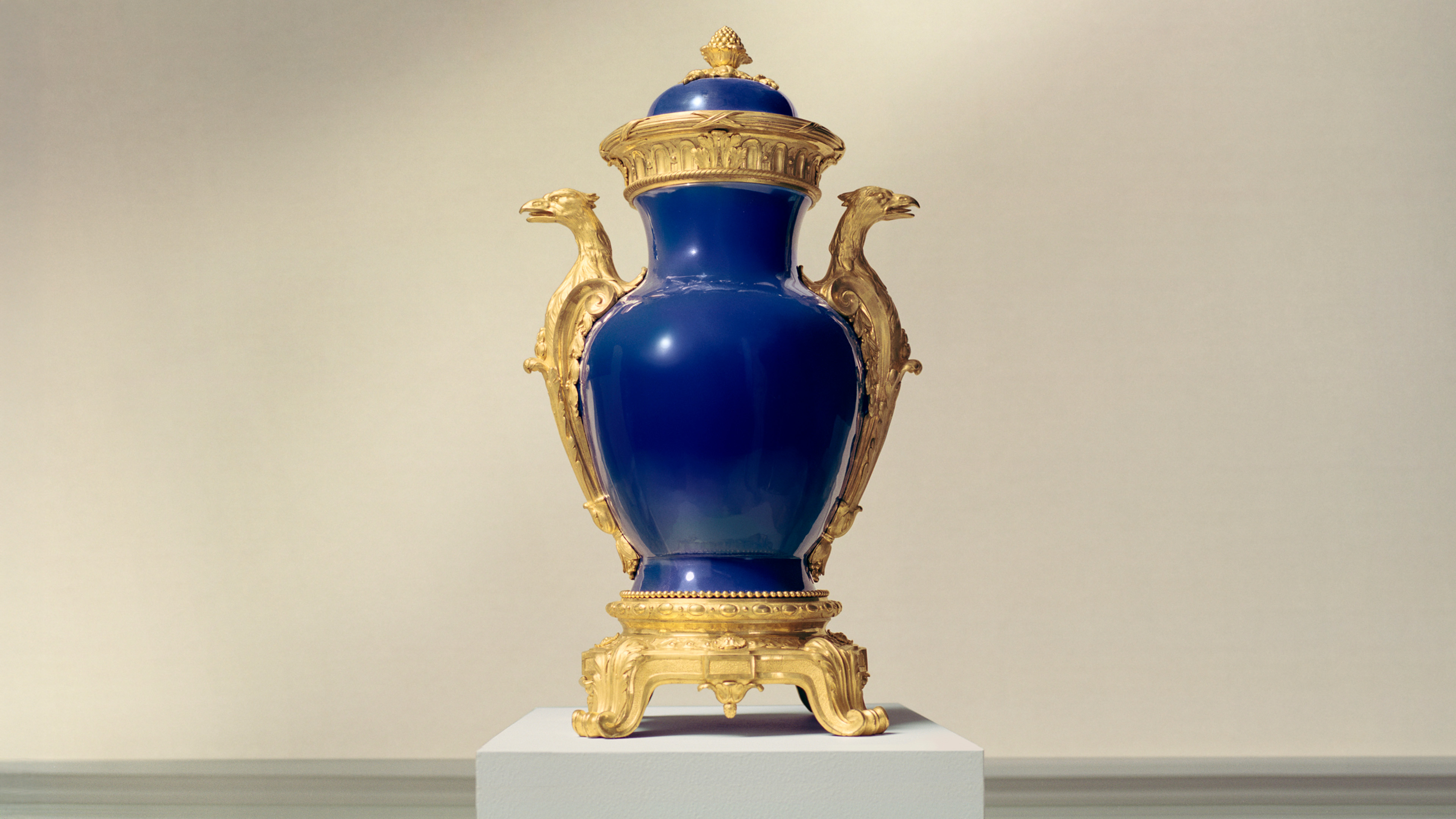 By around 1765, it was in France, where it was mounted with an elaborate gilt-bronze finial, collar, base and eagle-shaped handles. At nearly a metre high, it is one of the largest pieces of ormolu-mounted Chinese porcelain in existence.