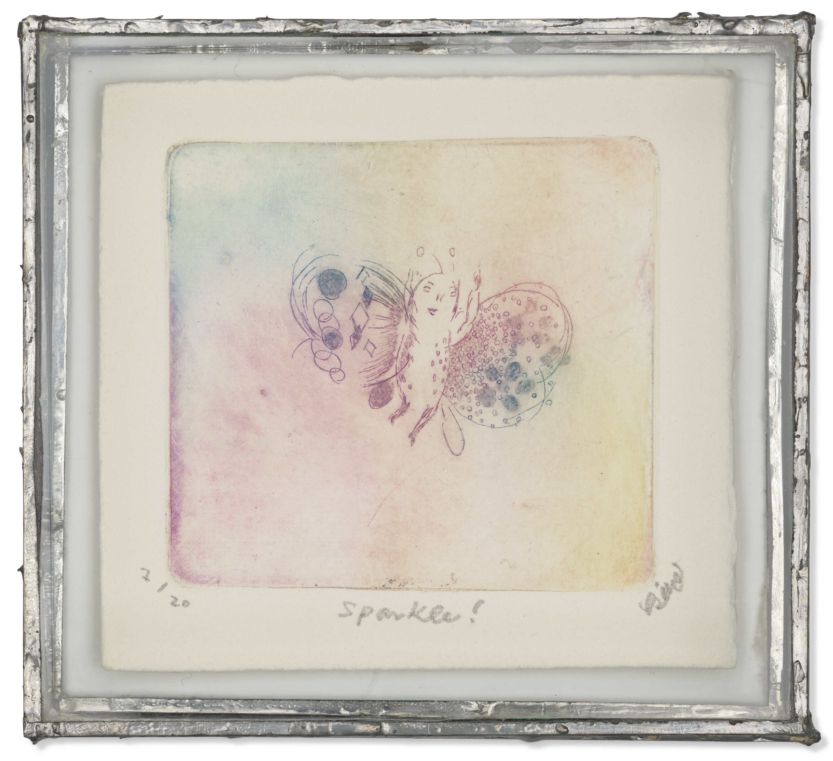 Maho Kino, Sparkle!, 2023. Etching and spit-bite etching on Japanese rice paper, enclosed in glass box with welded edges. The box: 4 x 4 1⁄2 x 1 1⁄4 in (10.2 cm x 11.4 cm). Estimate: $200-400. Offered in Inside Job: Christie’s New York Staff Art Show from 7 to 21 August 2025 at Christie’s Online