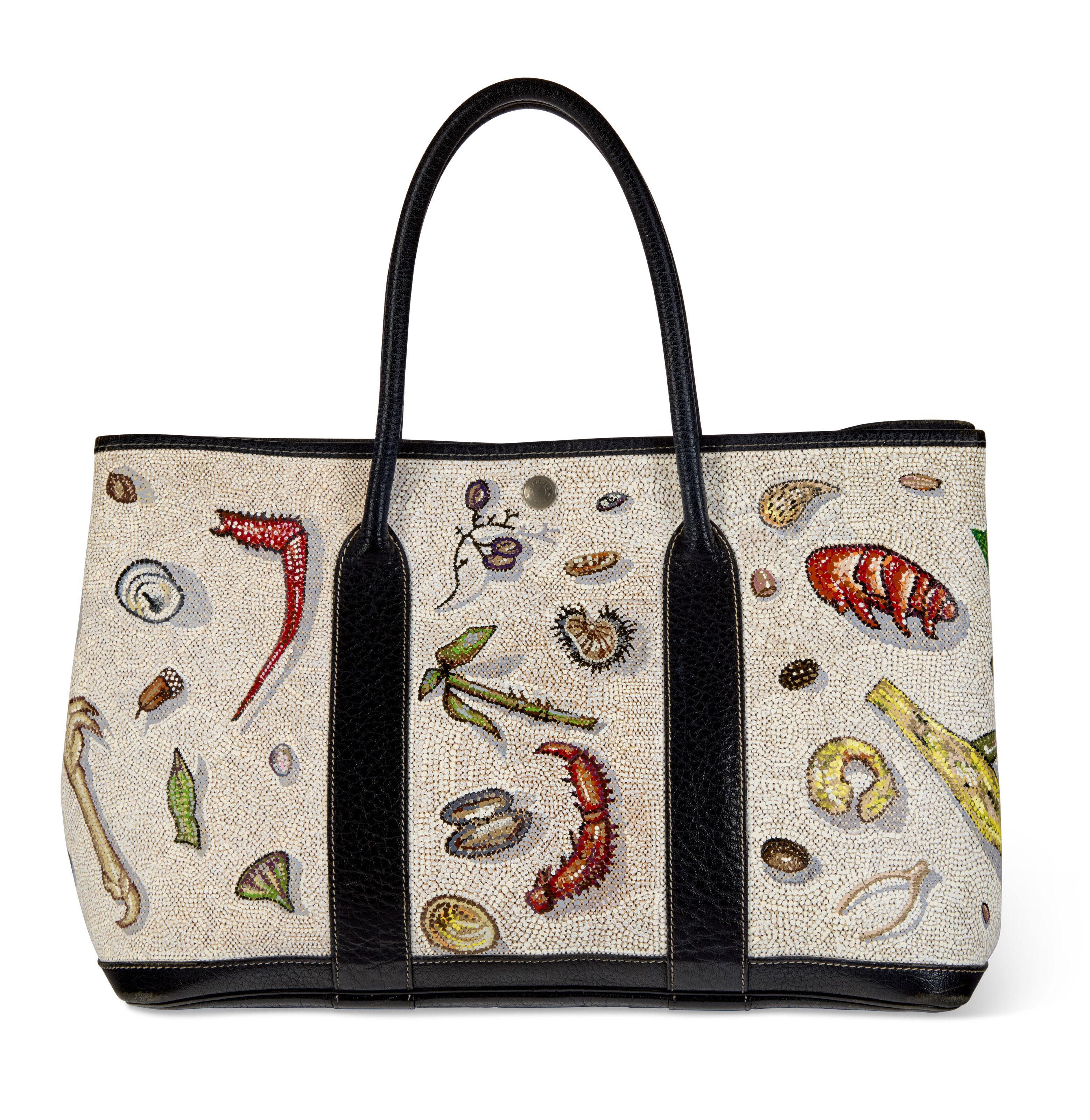 ‘I was inspired to create this piece after seeing an ancient Roman mosaic in the Vatican Museums last year. Titled The Unswept Floor, it depicts, in minute detail, the remnants of a fantastic Roman feast: torn lettuce leaves, lobster shells, nut casings, the works. The grid-like weave of a canvas Garden Party tote was the perfect scaffolding on which to lay my tesserae-like dots of paint and slowly generate my own fête-fatale.