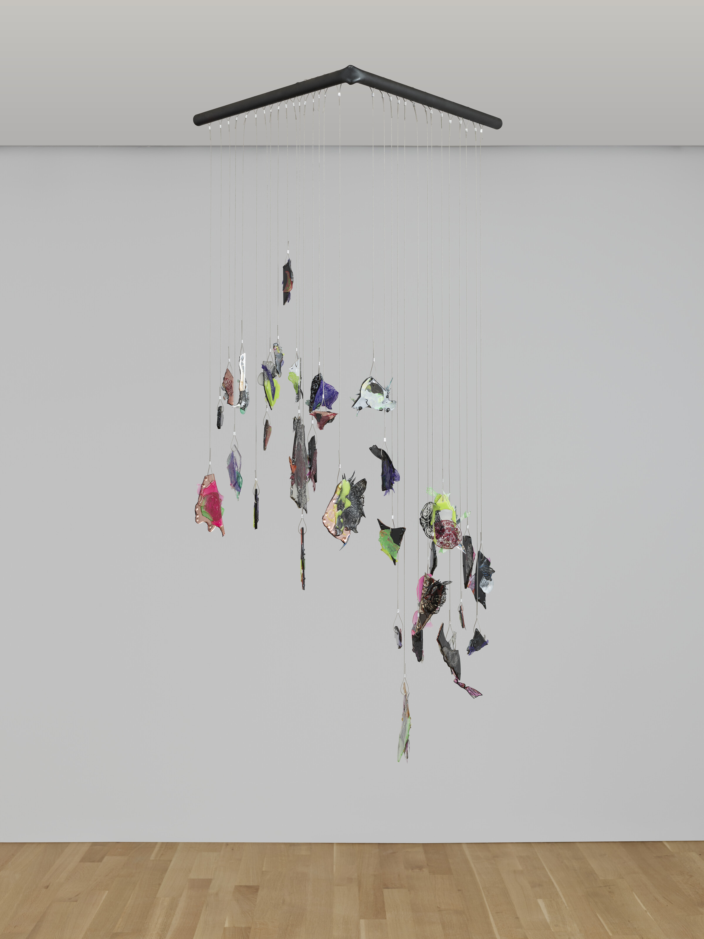 Khae Haskell, Murmeration #3, 2025. Reused acrylic scraps, mylar, pen, resin, steel cord, pvc piping, spray paint. 69 x 32 x 29 in (175.3 x 81.3 x 73.7 cm), hang height variable. Estimate: $2,000-3,000. Offered in Inside Job: Christie’s New York Staff Art Show from 7 to 21 August 2025 at Christie’s Online