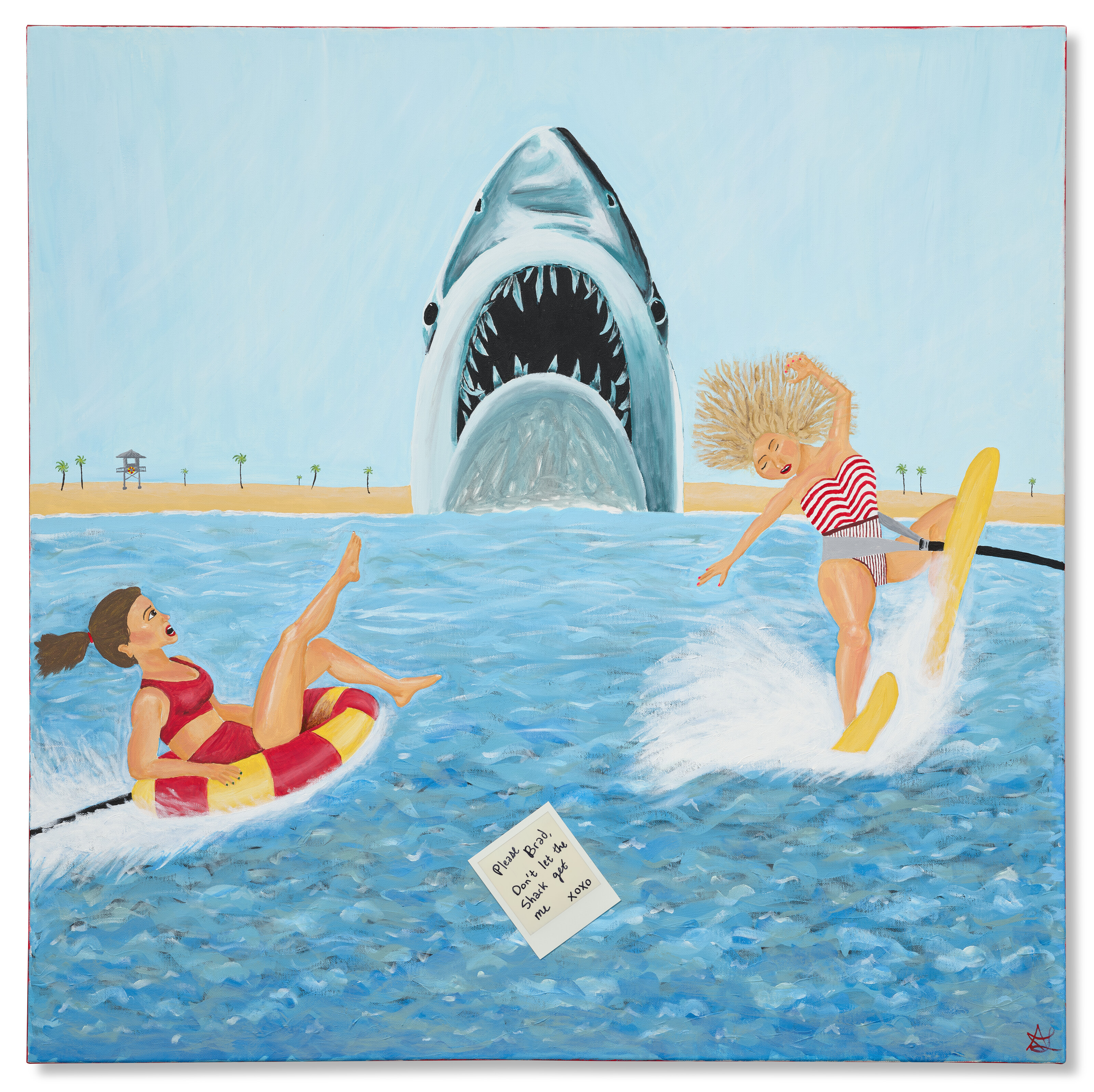 ‘I’ve long been fascinated by the interplay of artifice and mass-produced imagery, and this work explores that tension. The women in the scene are rendered almost like glossy blow-up dolls, conceived for our entertainment and pleading for salvation, in a subversion of Drowning Girl that also honours the 50th anniversary of Jaws (1975) — the film that forever changed visual media. Quint’s haunting line about a shark’s “lifeless eyes… like a doll’s eyes” lingered in my mind — and was said many times in that thick accent — as I painted.