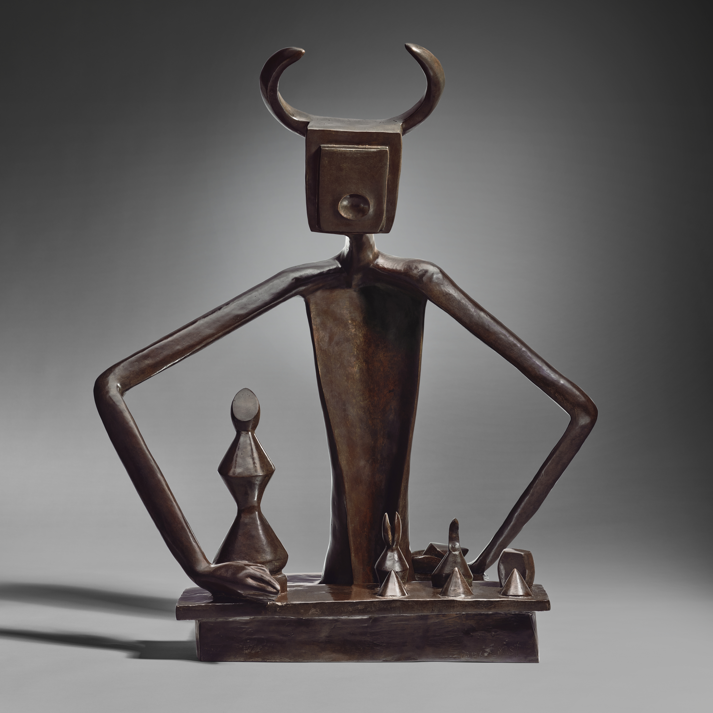 Max Ernst (1891-1976), Le roi jouant avec la reine, conceived 1944, cast 1961. Bronze with dark brown patina Height: 37¾ in (96 cm). Estimate: $14,000,000-18,000,000. Offered in The Collection of Robert F. and Patricia G. Ross Weis on 17 November 2025 at Christie’s in New York