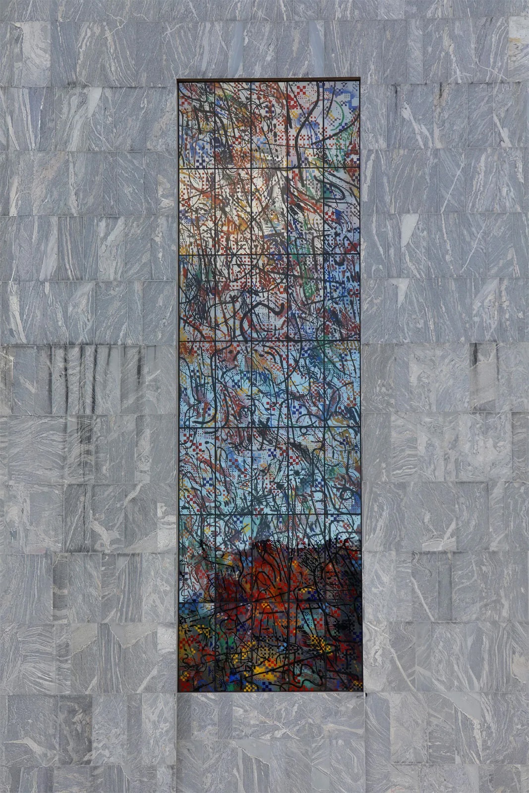 Julie Mehretu’s Uprising of the Sun, her first stained glass work, is inspired by President Obama’s remarks at the 50th anniversary of the marches from Selma to Montgomery. It measures a monumental 83 x 25 feet wide, installed on the building’s north face. Image courtesy The Obama Foundation