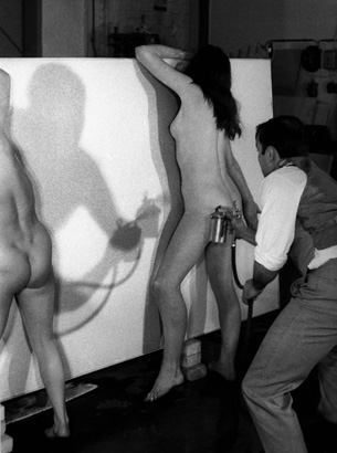 to act as his “brushes”. In the first step of the creative process, the models were doused with water and under Klein’s direction pressed themselves onto the large sheet of specially treated cardboard.