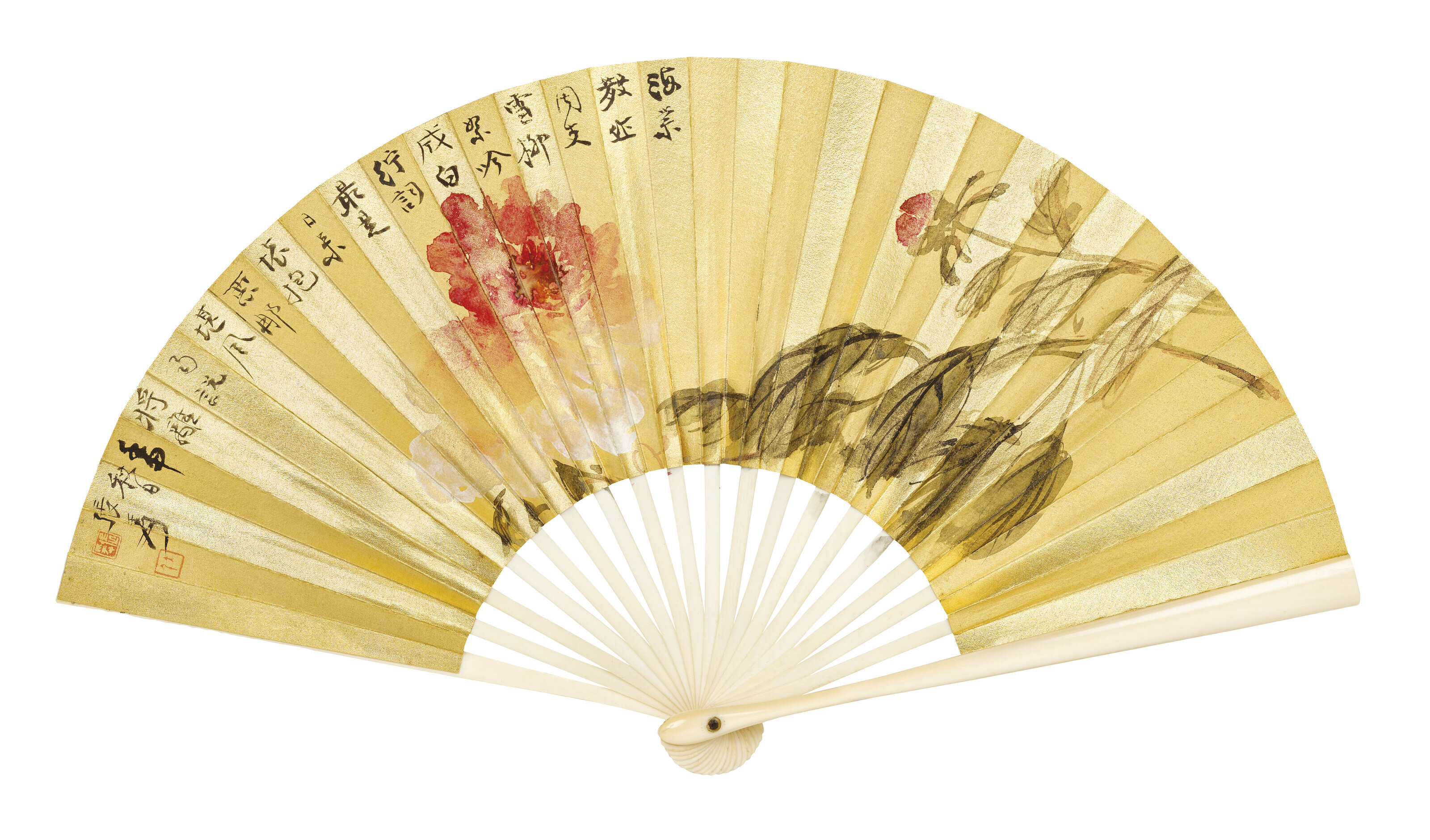 张大千(1899-1983),《海棠》。设色金绢/设色银绢 成扇 一九三二年作,10 x 32.5 公分 (3⅞ x 12¾ 英寸)。估价:200,000-300,000港元。此作将于2022年5月29日在佳士得香港中国近现代及当代书画拍卖呈献