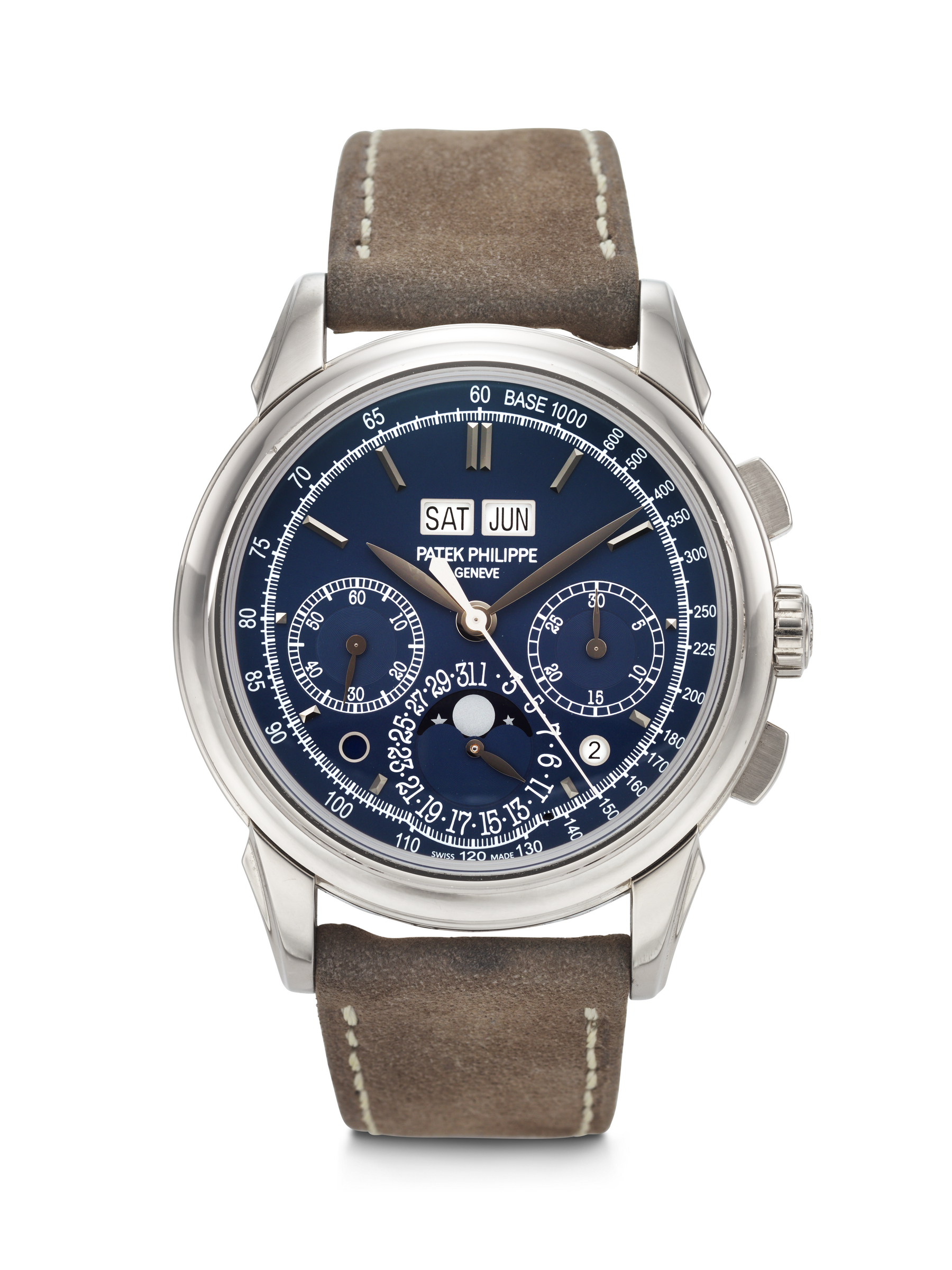 Patek Philippe. Extremely attractive white gold perpetual calendar chronograph wristwatch with moon phases, leap year and day/night indication, c. 2019. Ref. 5270g-014. Estimate: $120,000-160,000. Offered in Watches Online: The New York Edit on 4-13 December 2024 at Christie’s in New York