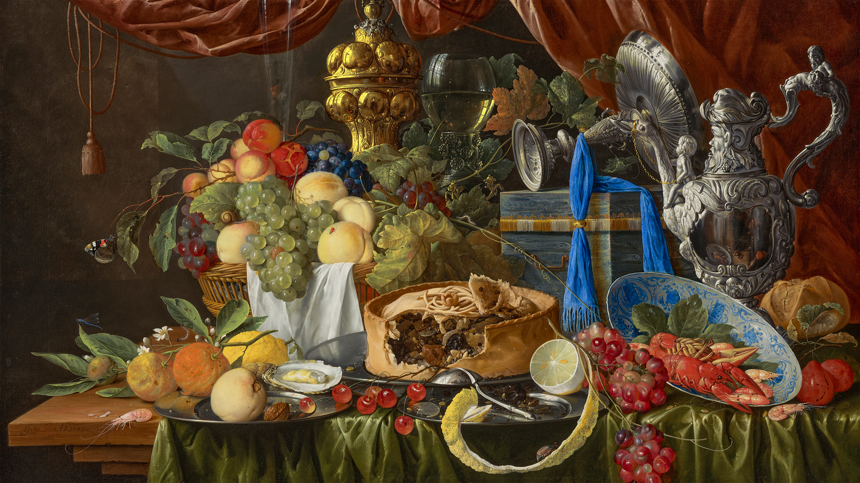 He did, however, reprise the theme on a smaller scale on several occasions, possibly at the behest of influential clients. One of his finest versions, A pronk still life with luxurious objects and exotic fruits, was completed in 1649 will be offered in the Old Masters Evening Sale at Christie’s in London on 1 July 2025. Measuring just over a metre wide, and described in Fred G. Meijer’s recent catalogue raisonné as the artist’s ‘core work’ of that year, the picture reveals, from behind a drawn-back, dark-red tasselled curtain, a table laid with a cut-open fruit pie, a bread roll, an oyster, a peeled lemon, oranges, cherries, plums, peaches, apricots and black grapes. There are also pewter plates, an upturned spoon and a Wanli porcelain dish, which contains crayfish and shrimps.