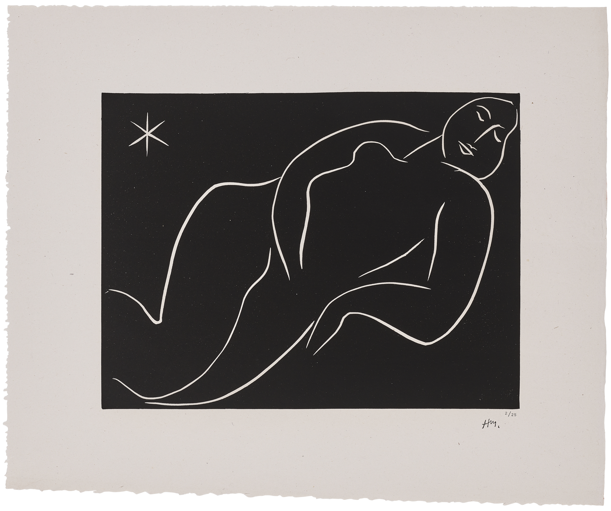 Henri Matisse (1869-1954), Nu à l’étoile, 1938. Linocut on Chine paper. Image: 9¼ x 12¼ in (235 x 311 mm). Sheet: 14⅝ x 17¾ in. (371 x 451 mm). Estimate: $8,000-12,000 Offered in Henri Matisse: Lines of Connection, Works on Paper From the Pierre and Tana Matisse Foundation on 24 September – 8 October 2025 at Christie’s in New York