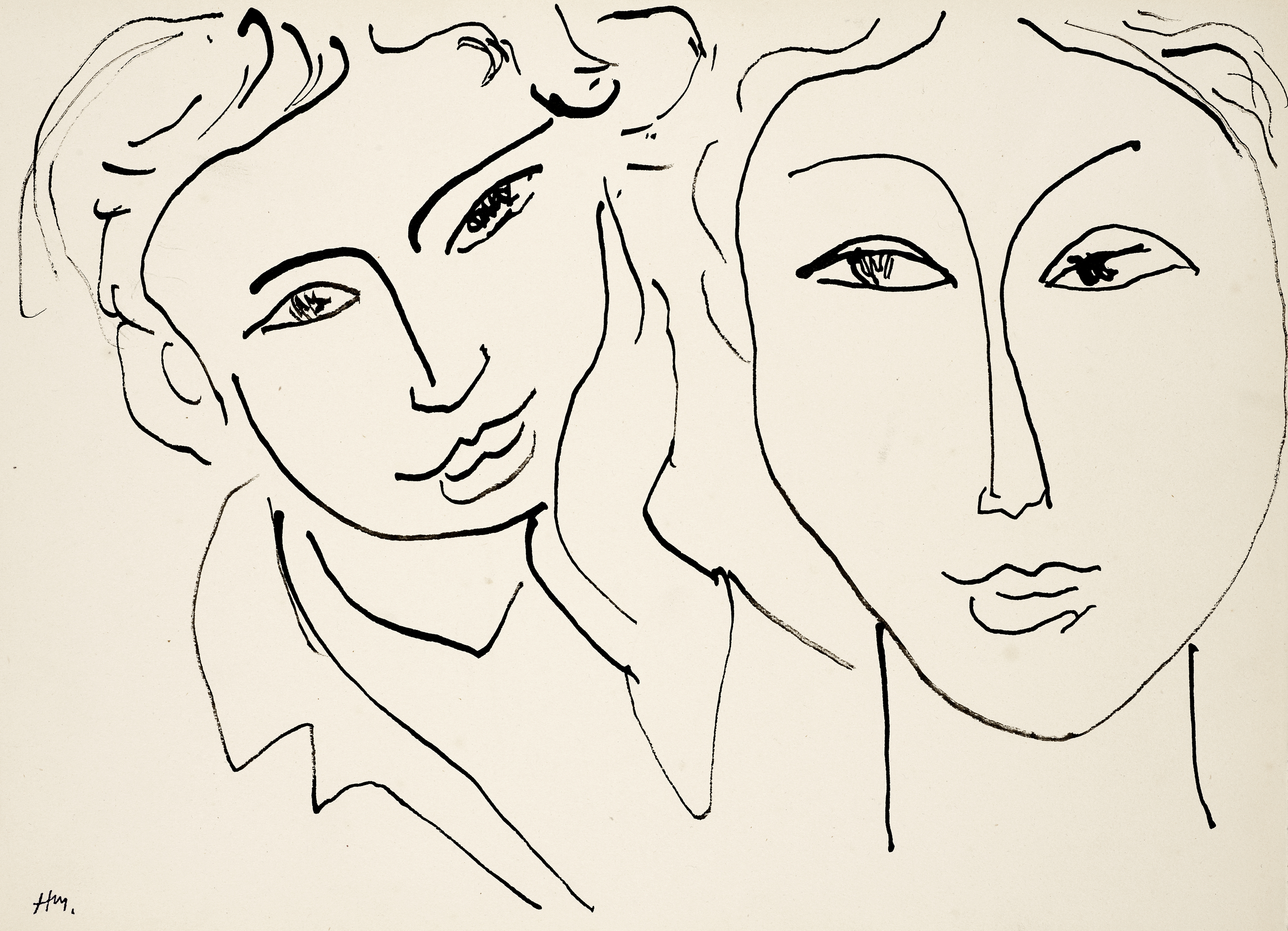 Henri Matisse (1869-1954), Deux têtes, 1947. Pen and India ink on paper. 11 x 15 in (27.9 x 38.1 cm). Estimate: $60,000-80,000. Offered in Henri Matisse: Lines of Connection, Works on Paper From the Pierre and Tana Matisse Foundation on 24 September – 8 October 2025 at Christie’s in New York