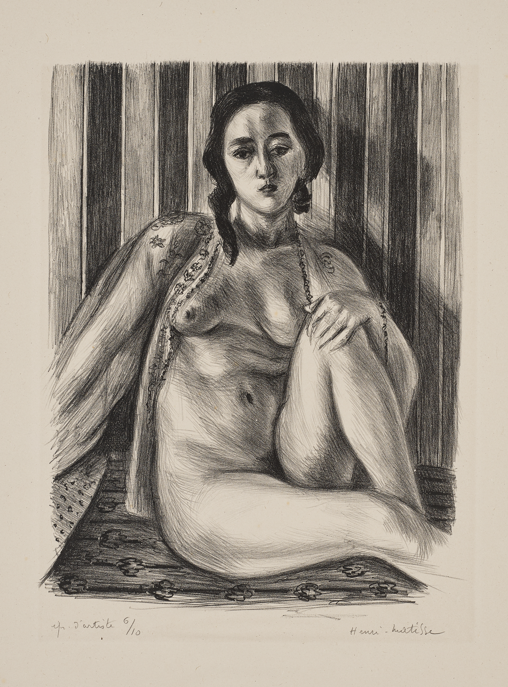 Henri Matisse (1869-1954), Nu assis à la chemise de tulle, 1925. Lithograph, on Chine paper. Image: 14¼ x 10⅝ in (362 x 270 mm). Sheet: 22½ x 15⅛ in (572 x 384 mm). Estimate: $25,000-35,000. 11⅜ x 15 in (289 x 381 mm). Sheet: 16½ x 20⅜ in (420 x 518 mm). Estimate: $18,000-25,000. Offered in Henri Matisse: Lines of Connection, Works on Paper From the Pierre and Tana Matisse Foundation on 24 September – 8 October 2025 at Christie’s in New York
