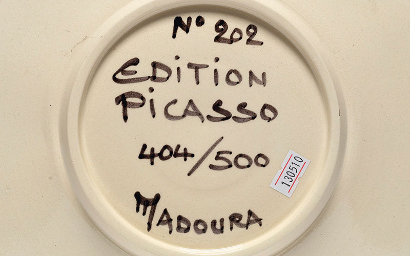 The most common markings and stamps found on Picasso ceramics read Madoura Plein Feu, Edition Picasso, Empreinte Originale de Picasso and d’Après Picasso – all of which indicate an authentic limited edition.