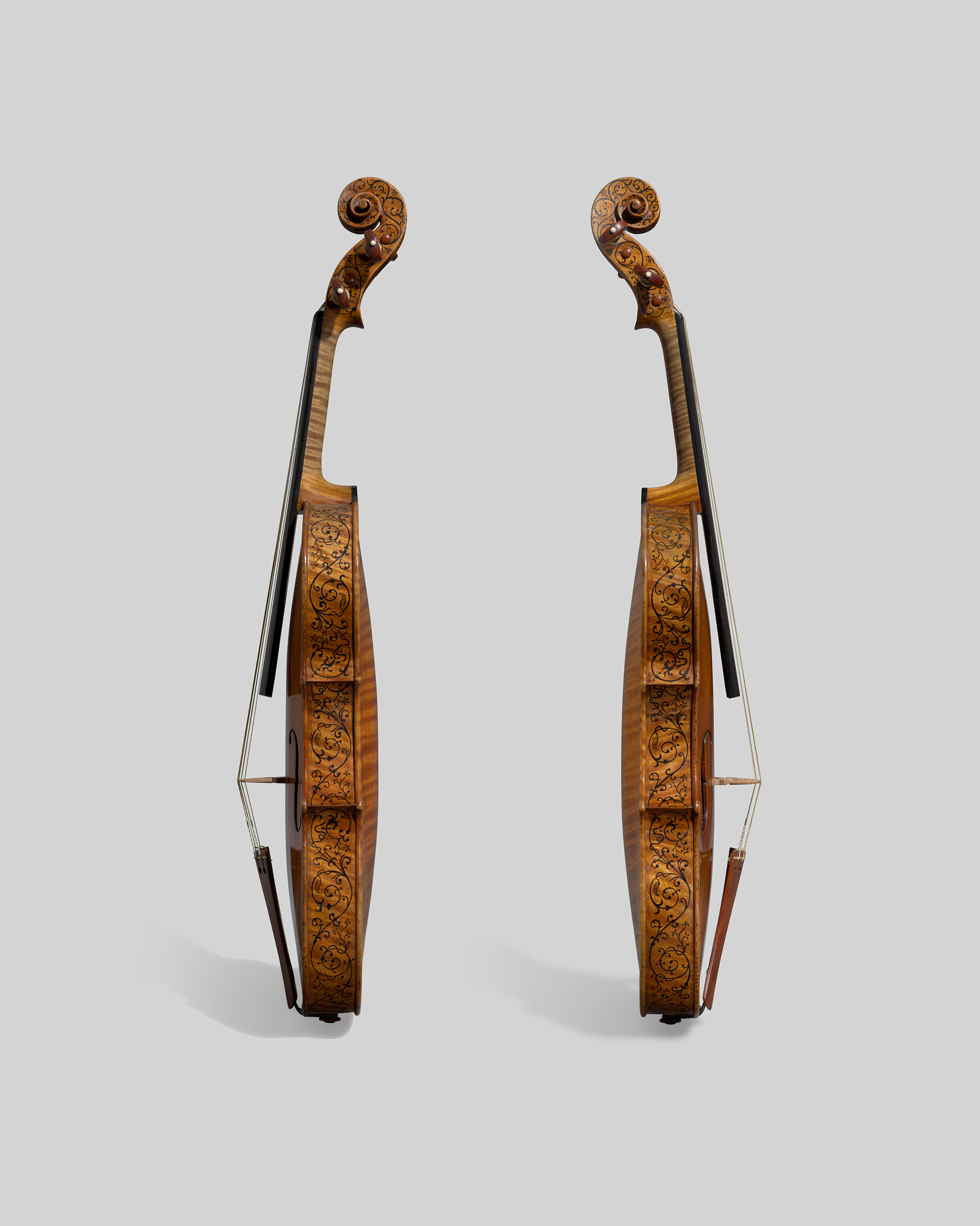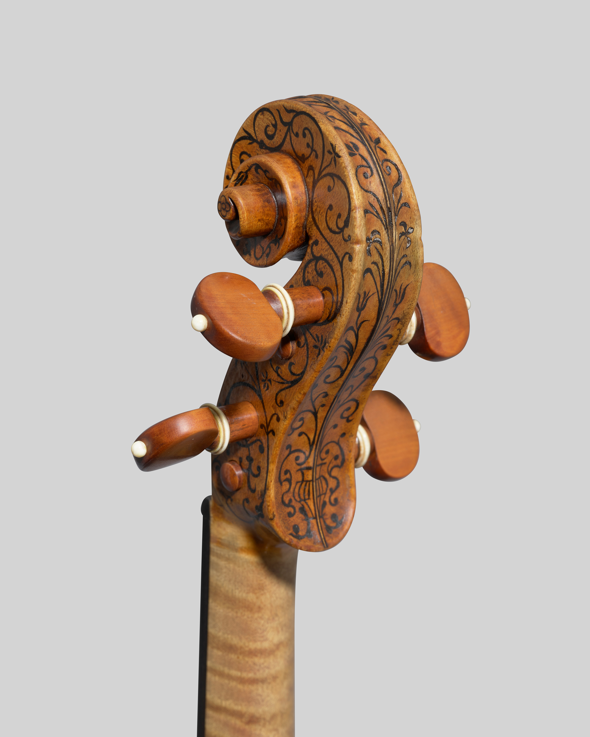 Bearing its original internal label dated 1679, the violin’s well-preserved varnish is a lustrous golden-orange hue over a glowing golden ground. The original decoration is in the form of diamond and pearl-shaped inlay around the front and back outline, with intricate ornamentation on the ribs and scroll