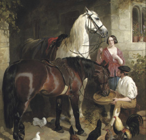 Groom and maiden feeding a bay and grey in a yard, with birds in the foreground