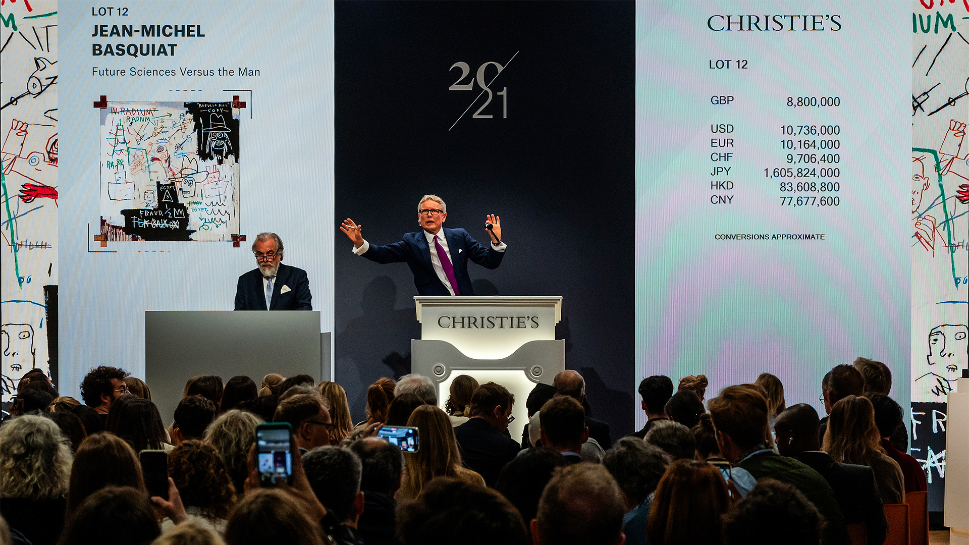 Christie’s Global President Jussi Pylkkänen at the rostrum with Jean-Michel Basquiat’s Future Sciences Versus the Man (1982). The work sold for £10,430,000 on 13 October 2023 at Christie’s in London
