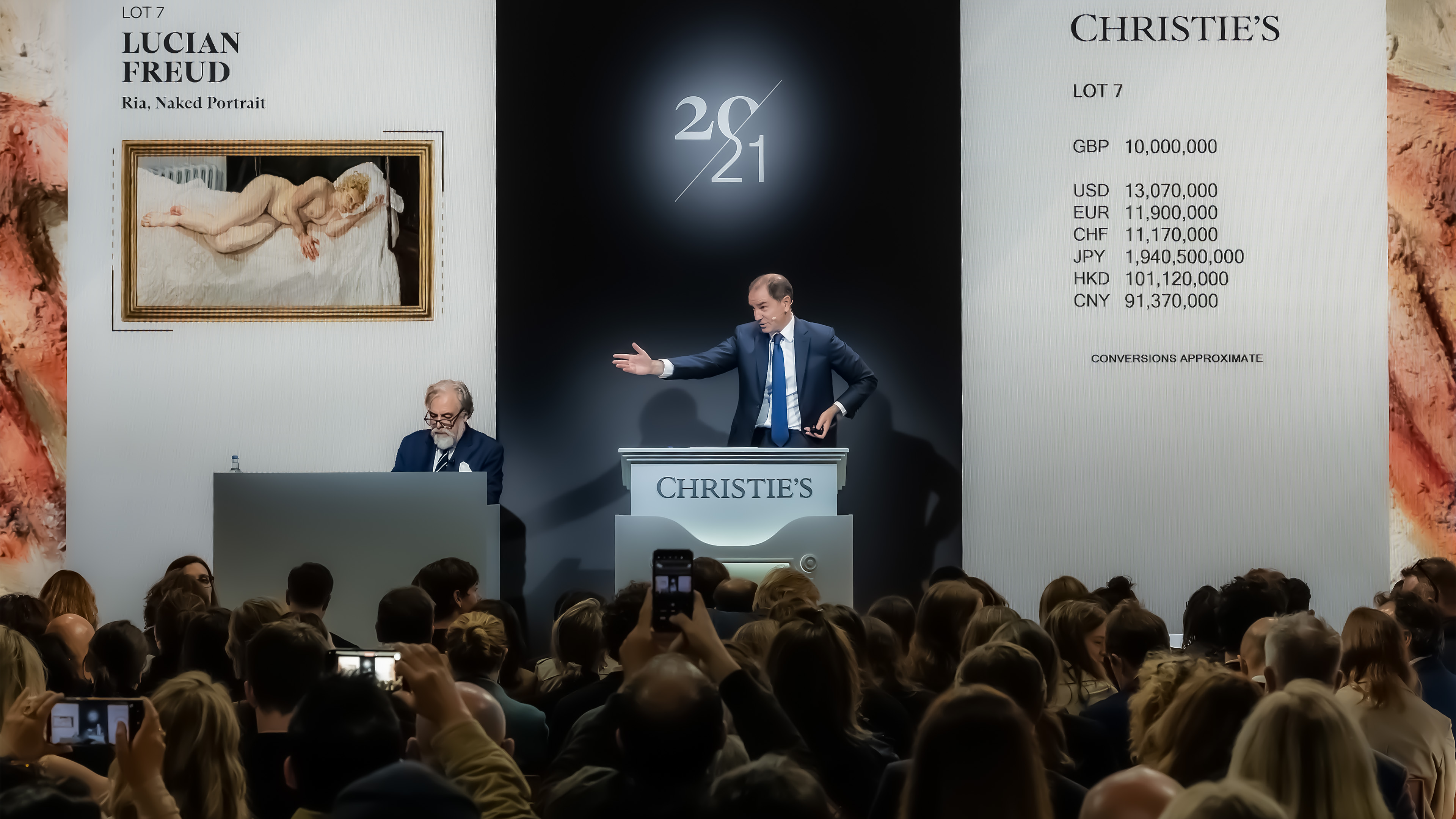Adrien Meyer, Christie’s Co-Chairman, Impressionist & Modern Art, at the rostrum with Lucian Freud’s Ria, Naked Portrait. The work sold for £11,810,000