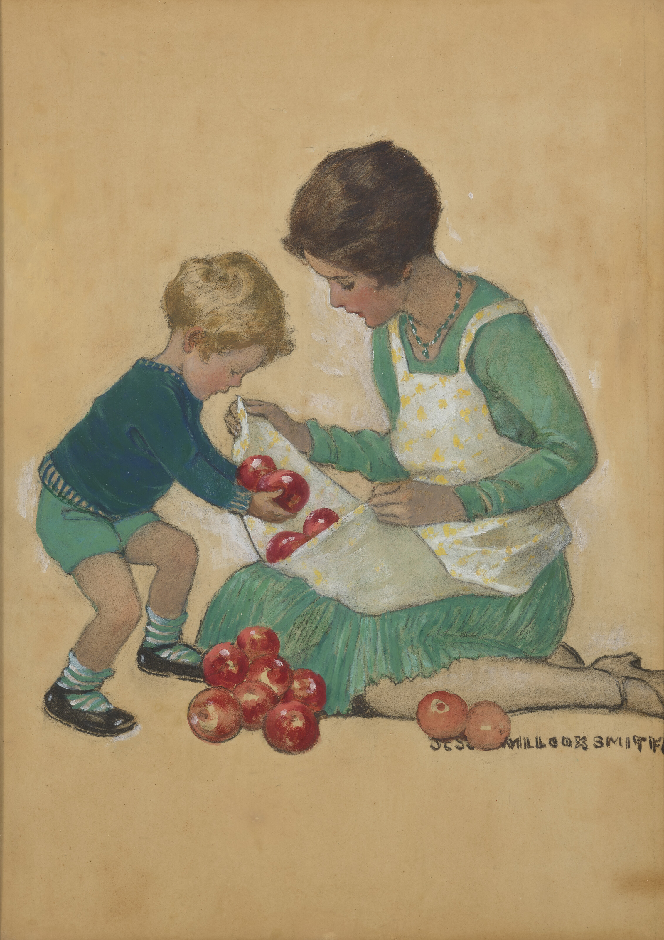 Jessie Willcox Smith (1863-1935), Mom with Apples, c. 1929. Mixed media on paperboard. 21½ x 16 in (54.6 x 40.6 cm). Estimate: $60,000-80,000. Offered in Modern American Art on 16 April 2026 at Christie’s in New York