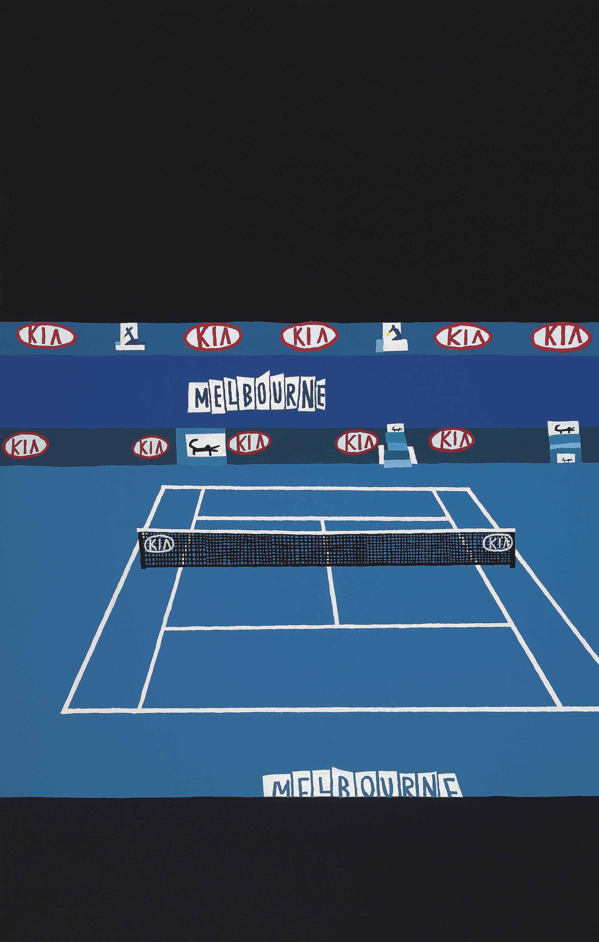 Jonas Wood’s tennis court works transform courts into vibrant, geometric abstractions. Stripping away players and crowds, his paintings focus on the stadium’s shapes and colours, creating a dynamic sense of anticipation. An avid sports fan, Wood channels his love for athletics and contemporary pop art style to capture the rhythm and energy of tennis.