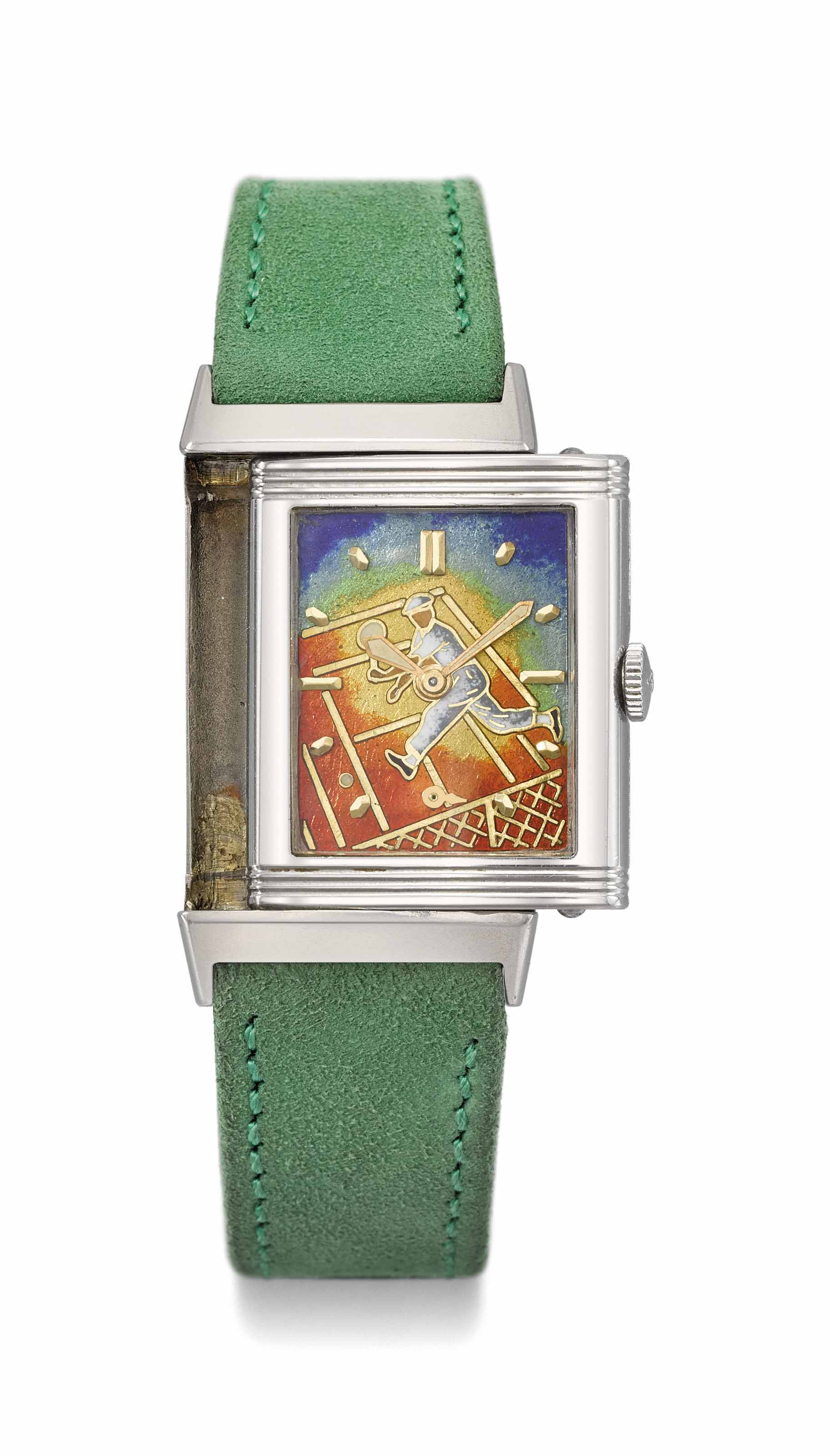 Jaeger-LeCoultre. A fine, rare and very attractive stainless steel “Staybrite” reversible wristwatch with cloisonné enamel dial, made for the 1952 Roland Garros tennis tournament. Sold for CHF 52,500 on 13 May 2018 at Christie’s in Geneva