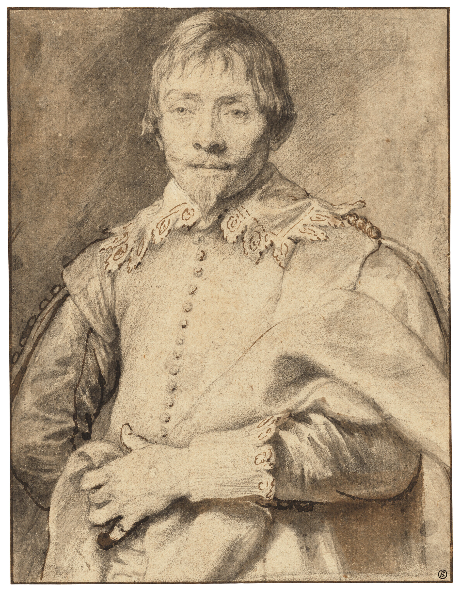 Van Dyck executed the drawing in an intuitive graphic style that displays his outstanding facility in mark-making. ‘There is real variation in technique, finish and the general appearance of the drawing,’ says Alsteens. ‘I thought it was almost breathtakingly beautiful and well preserved.’ While the initial drawing was completed in chalk, wash and brush, Van Dyck painstakingly retouched the surface in pen to add another layer of detail, as on the lace collar and jacket buttons. ‘It is’, Alsteens asserts, ‘among Van Dyck’s most finely executed drawings.’