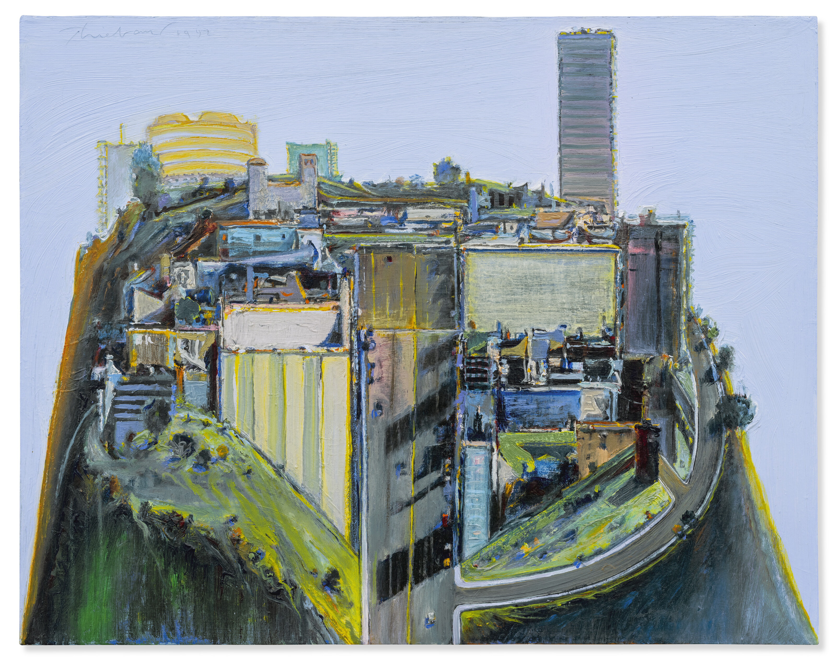 Wayne Thiebaud (1920-2021), Night Village, 1992-1993. Acrylic on canvas, 22 x 28 in (55.9 x 71.1 cm). Estimate: $800,000–1,200,000. Offered in the Post-War & Contemporary Art Day Sale on 20 November 2025 at Christie’s in New York
