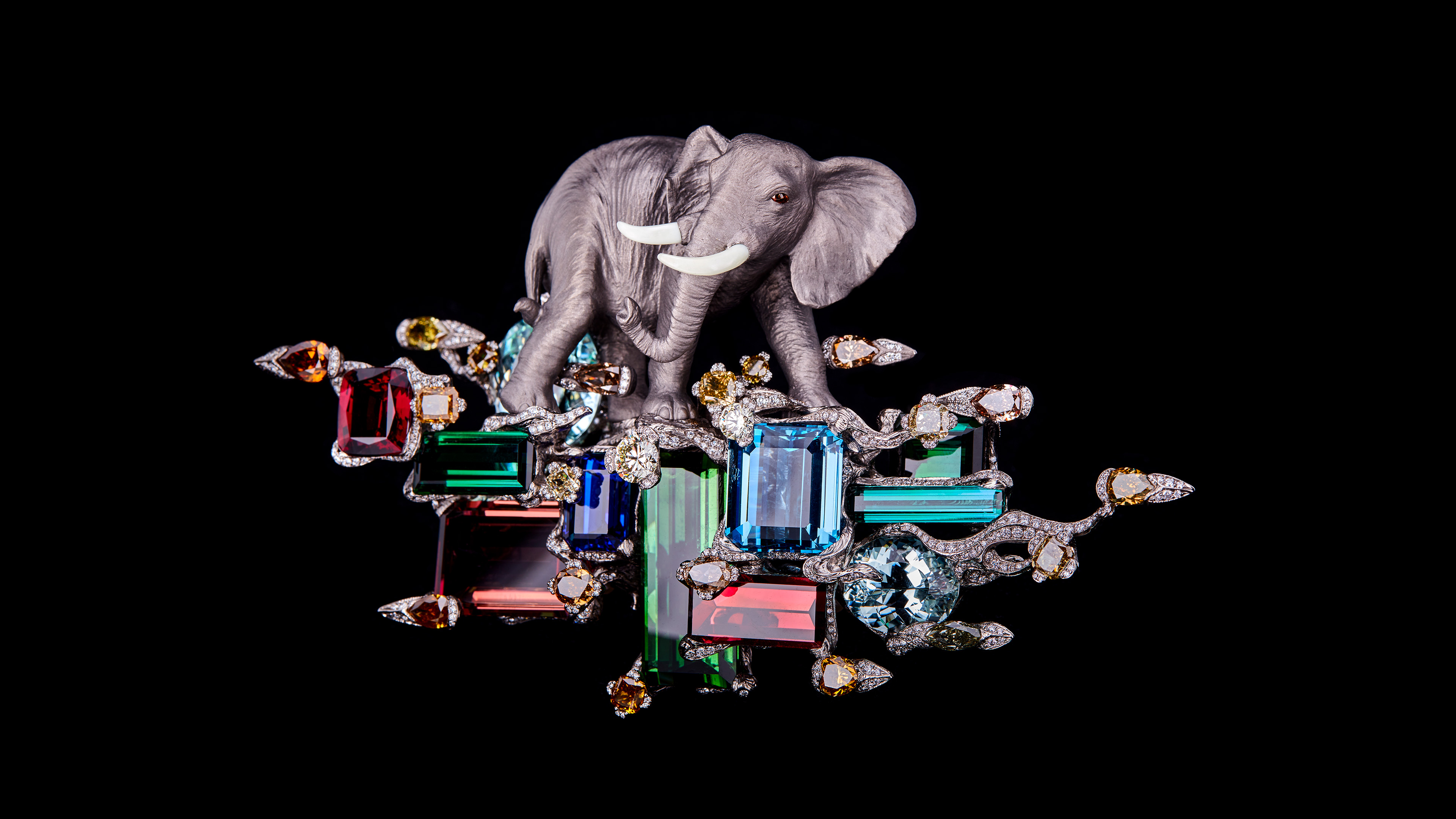 Also noteworthy is The Beauty of Greatness, a brooch in which a titanium elephant with Wallace Chan Porcelain tusks walks on a bed of gems including green tourmaline, rubellite and aquamarine.