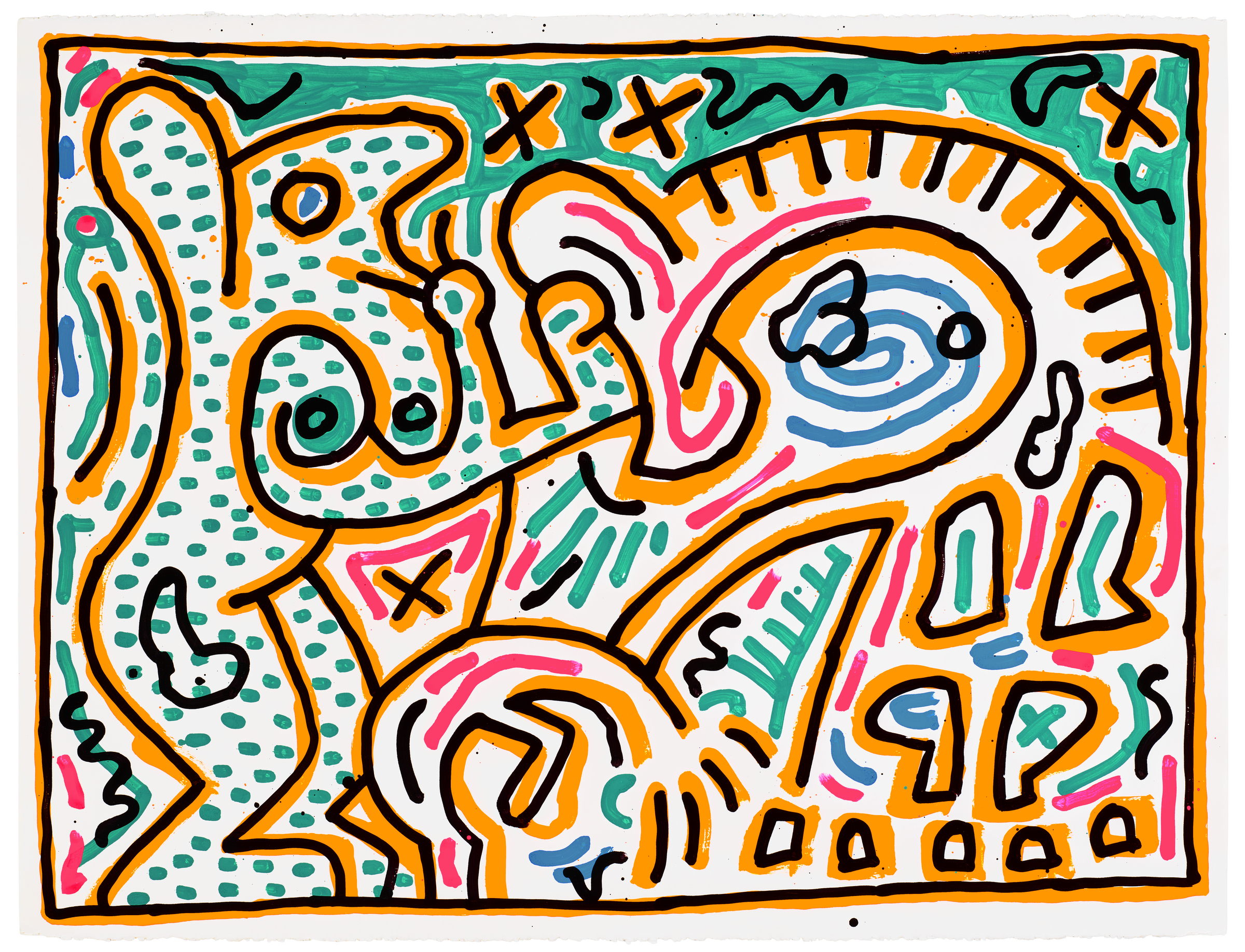 Keith Haring (1958-1990), Untitled, 1984. Acrylic and Sumi ink on paper. 38 x 50 in (96.5 x 127 cm). Estimate: $300,000-500,000. Offered in Post-War to Present on 26 February 2026 at Christie’s in New York