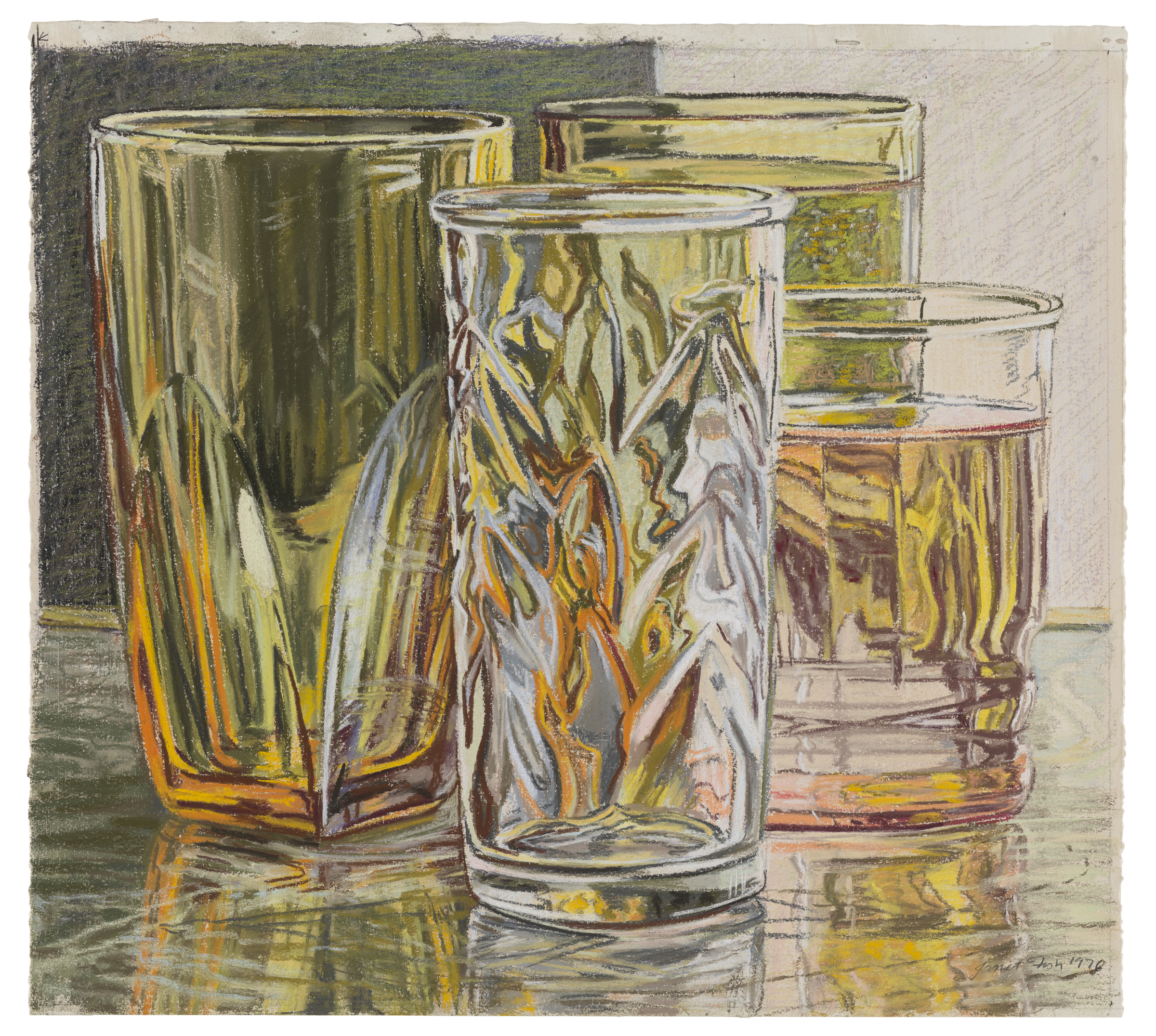 Janet Fish (1938-2025), Yellow and Amber Glasses, 1976. Pastel on paper. 21¾ x 24 in (55.2 x 61 cm). Estimate: $7,000-10,000. Offered in First Open | Post-War & Contemporary Art, featuring Drawings from the Collection of the Late Janie C. Lee, Sold for the Benefit of the Menil Drawing Institute on 17-27 February 2026 at Christie’s in New York
