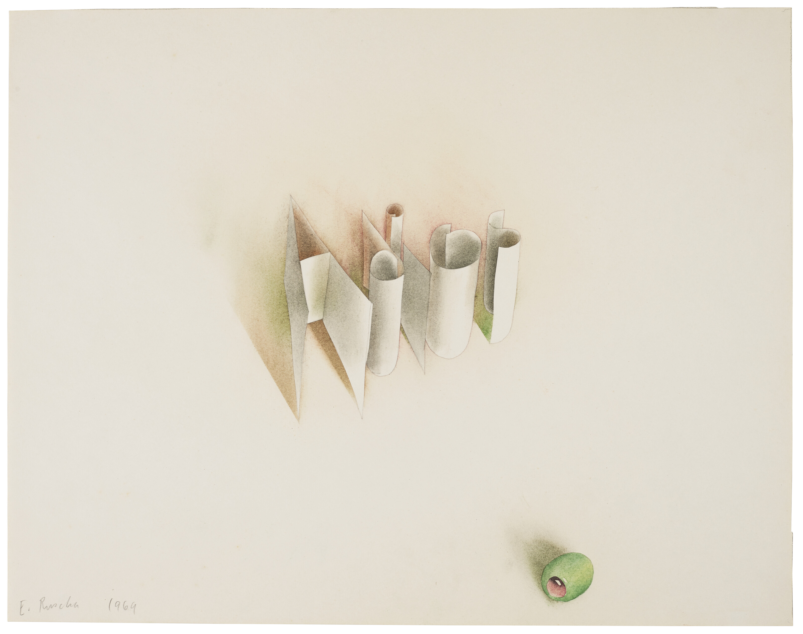 Ed Ruscha (b. 1937), Adios with Olive, 1969. Pastel and graphite on paper. 11¼ x 14½ in (28.2 x 36.8 cm). Estimate: $250,000-350,000. Offered in Post-War and Contemporary Day Sale on 20 November 2025 at Christie’s in New York
