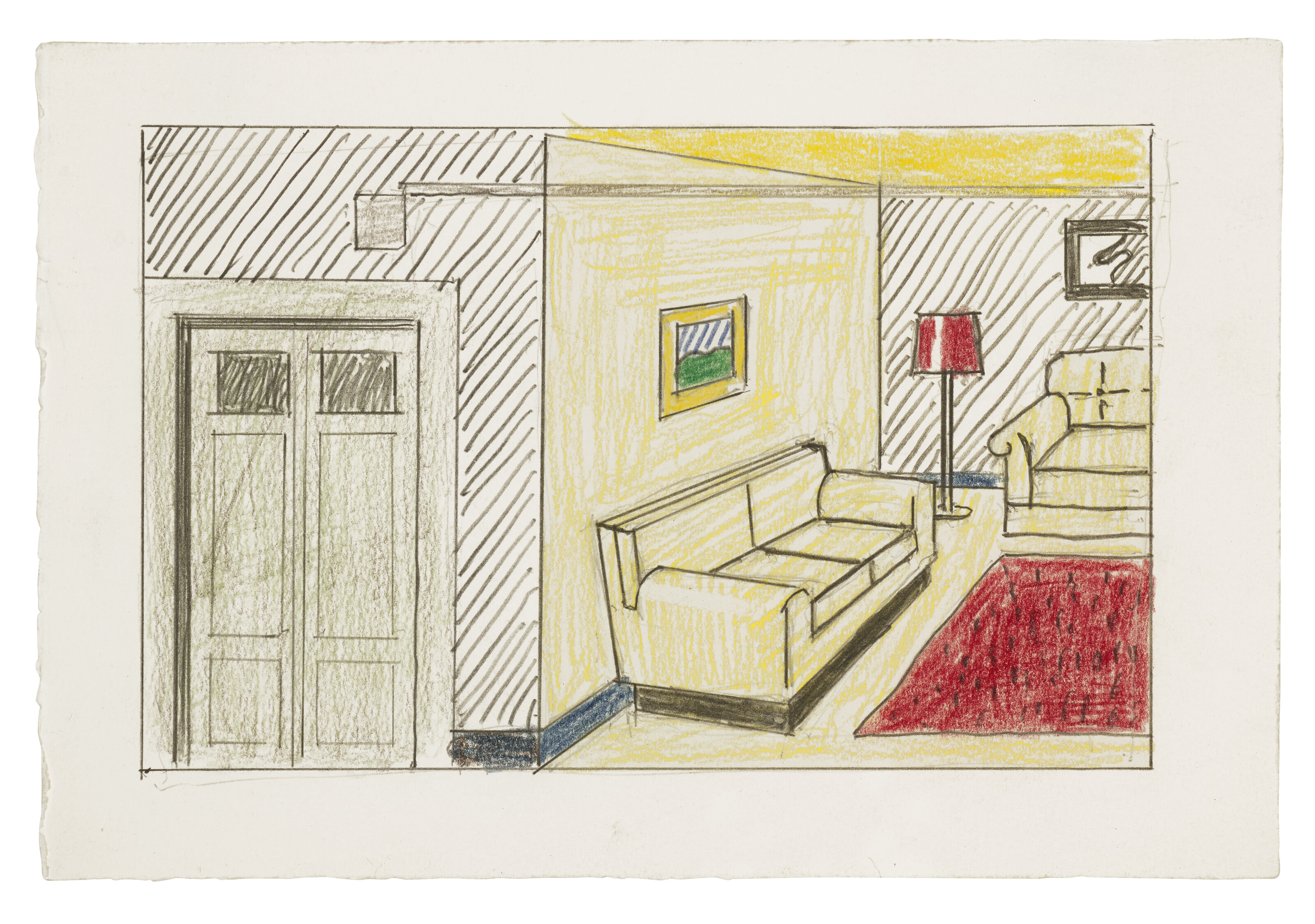 Roy Lichtenstein (1923-1997), Interior (Study), 1989. Coloured pencil and graphite on paper. Image: 5¾ x 9 in (14.6 x 22.9 cm). Sheet: 7½ x 11⅛ in (19.1 x 28.2 cm). Estimate: $80,000-120,000. Offered in Post-War and Contemporary Day Sale on 20 November 2025 at Christie’s in New York