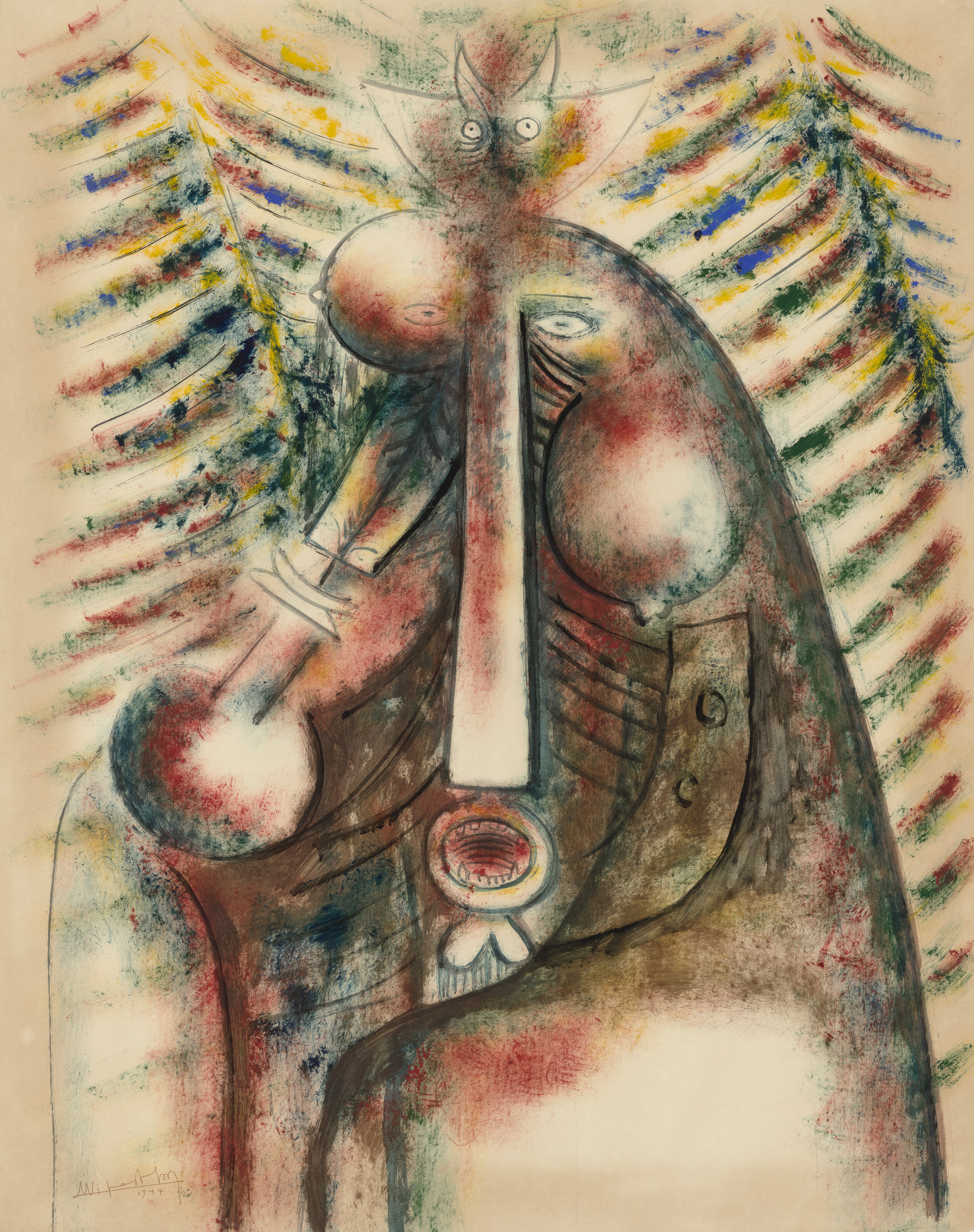 Wilfredo Lam (1902-1982), Phénomènie phaline, 1944. Oil and gouache on paper. 37¼ x 29½ in (94.6 x 74.9 cm). Estimate: $250,000-350,000. Offered in Impressionist and Modern Works on Paper Sale on 18 November 2025 at Christie’s in New York
