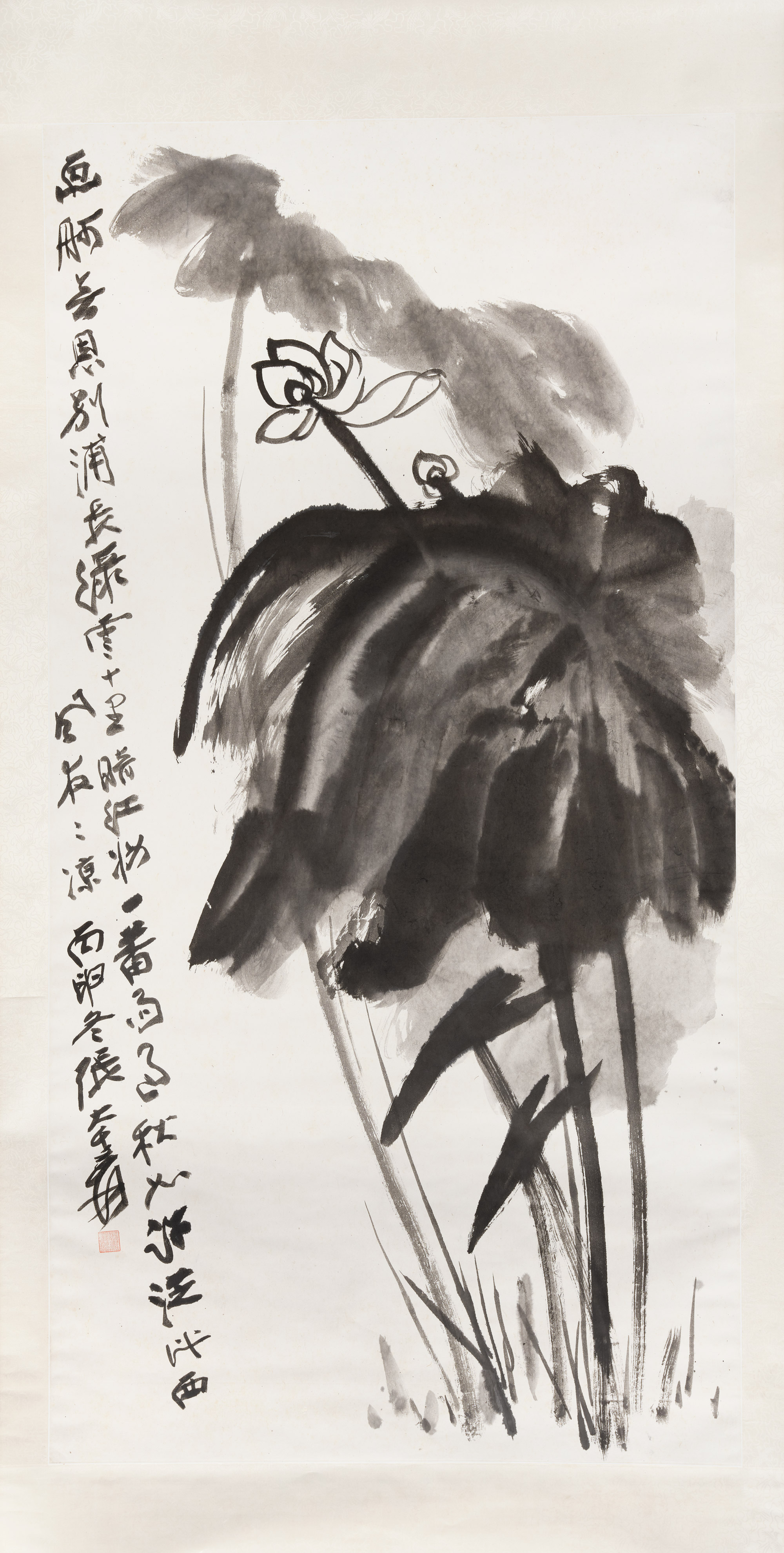 张大千,《 秋荷 》 。水墨纸本 镜框 一九五六年作。185 x 95 公分 (72 ⅞ x 37 ⅜英寸)。估价:港元4,000,000–5,000,000。此拍品将于2026年4月29日在佳士得香港中国近现代及当代书画拍卖中呈献