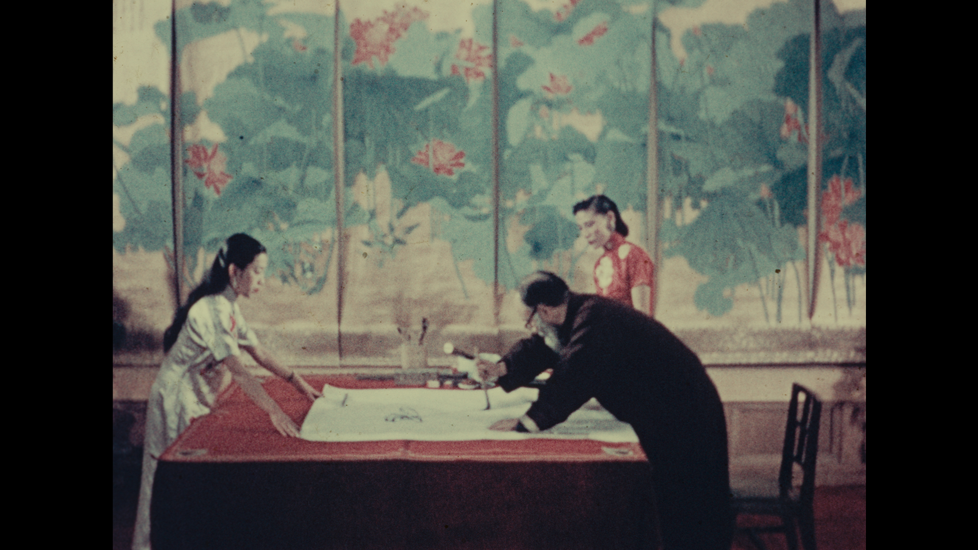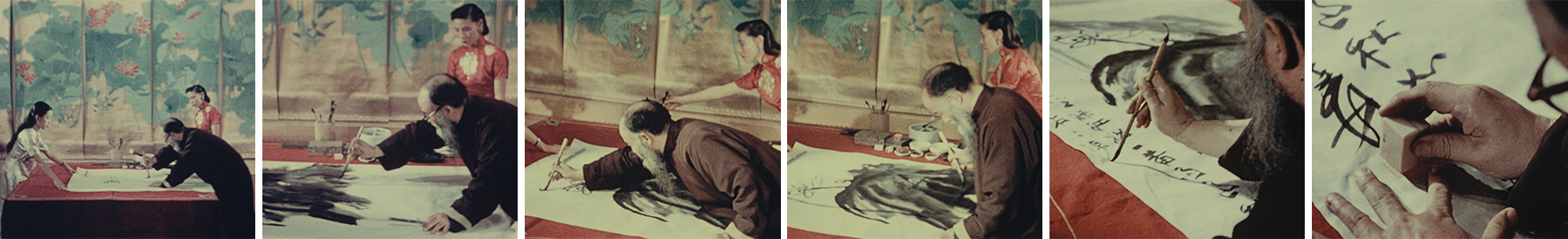 拍摄期间,朱旭华安排张大千以没骨法绘制一幅荷花。演示在旅馆的一间大厅内进行,张大千将自己的一幅六屏工笔荷花作品选作画案后的背景。他的妻子徐雯波在旁协助,另有一位助手在绘画过程中帮他牵引画纸。短短几分钟内,他将一张六尺白纸变成了一幅生动而富有张力的荷花图,并在画上题写了一首七言诗,最后钤上一枚印章。尽管朱旭华最终未能完成这部纪录片,但保留下来的影像资料成为张大千作画过程的第一部彩色动态影像——这是一份极具历史价值和教学意义的珍贵资料,为观者提供了难得的机会,得以窥见他的创作过程。影片记录了艺术家的身体动作、习惯性手势、执笔方式、描绘阔大荷叶时的流畅笔触,以及他落款、钤印的瞬间。