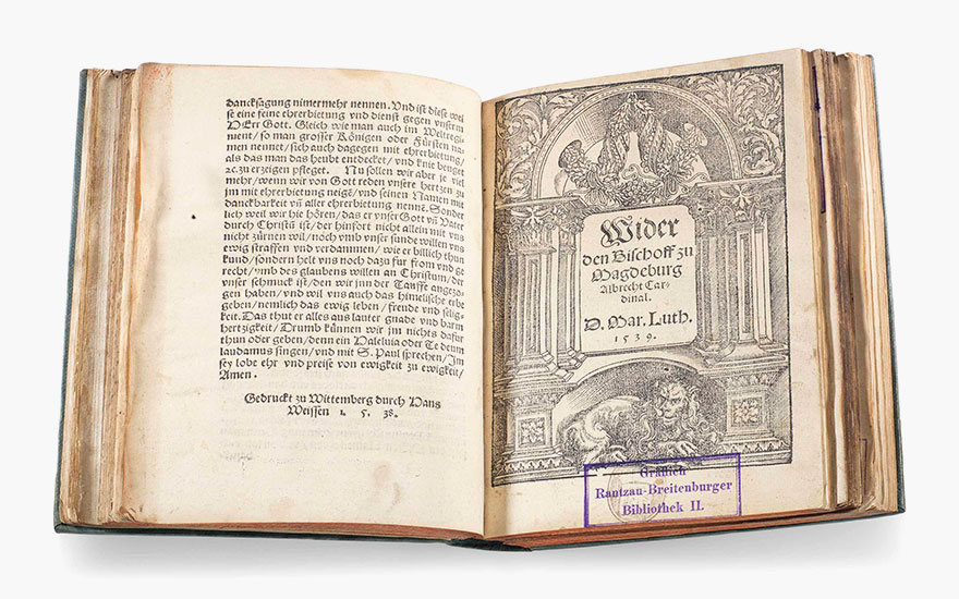 拉丁文初版,极其珍罕、可能为独一无二的马丁·路德与菲利普·梅兰希通木版画,连彩色前后页。Leipzig: Ernest Vögelin,1560年1月。2017年7月12日于佳士得伦敦售出,成交价20,000英镑