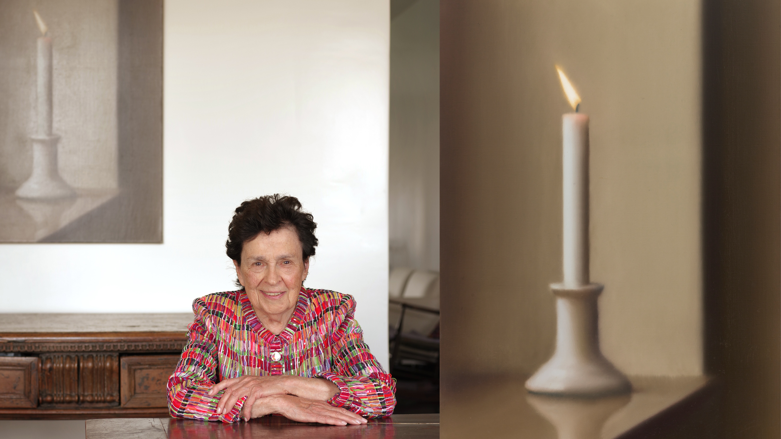 Left: Marian Goodman at home in New York with Richter’s Kerze (Candle) (1982), 2018. Photo: Sharon Lockhart. Right: Gerhard Richter (b. 1932), Kerze (Candle), 1982. Oil on canvas. 39½ x 27¾ in (100.3 x 70.5 cm). Estimate: $35,000,000-50,000,000. Offered in Marian’s Richters & 21st Century Evening Sale on 20 May 2026 at Christie’s in New York