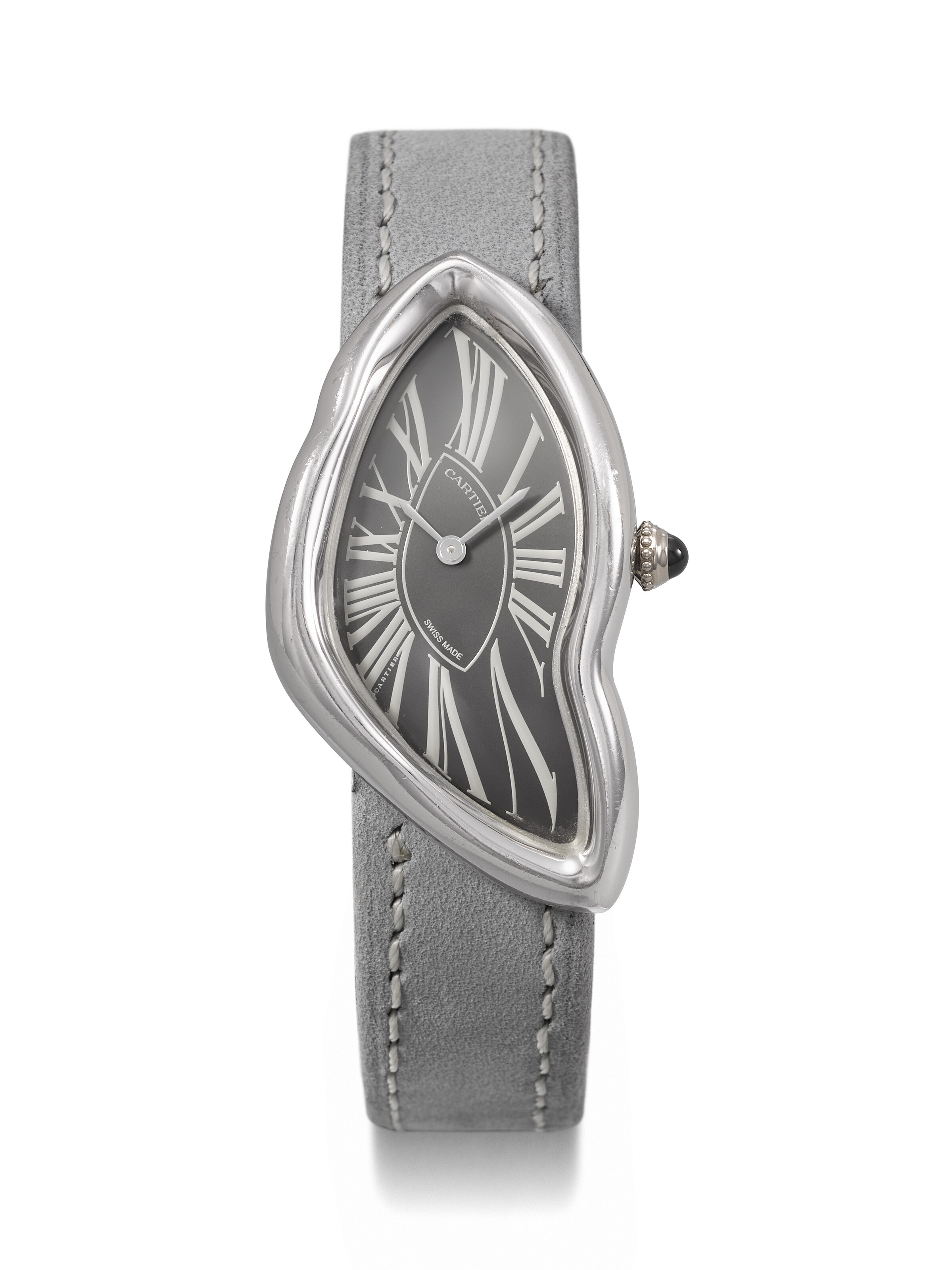 Cartier, A special order and previously unknown 18k white gold asymmetrical wristwatch with ‘nickelé’ grey dial and ‘crash’ deployant clasp, Crash model, c. 2021. Sold for CHF 756,000 on 12 May 2025 at Christie’s in Geneva