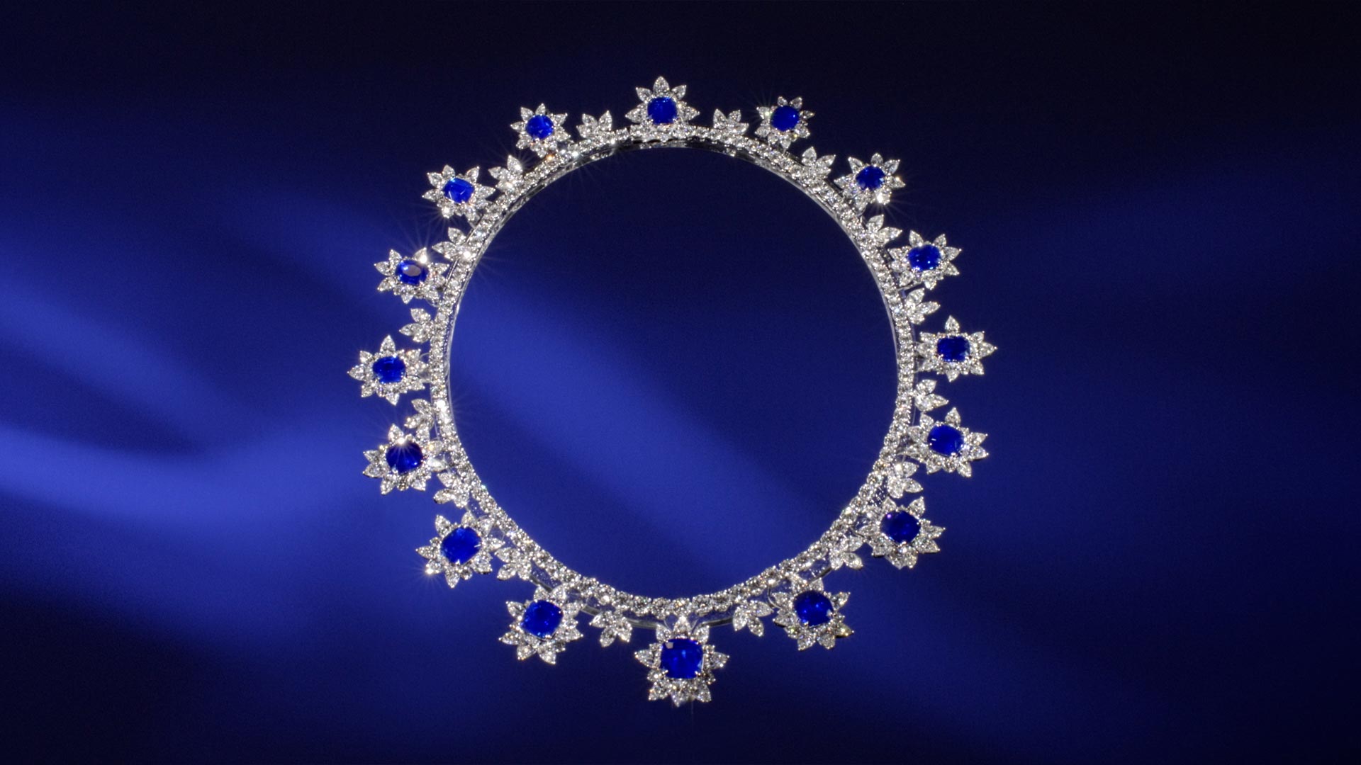 The Peacock necklace,藍寶石及鑽石項鍊。此拍品於2018年11月在佳士得香港瑰麗珠寶及翡翠首飾拍賣中售出,成交價港元116,537,500